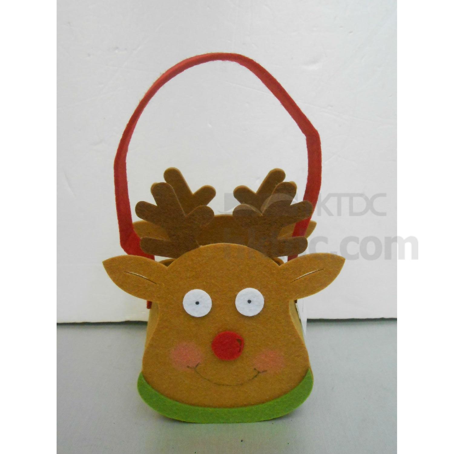 This polyester bag has a felt surface to offer a comfortable touch and comes in the design of a smiling reindeer. It provides ample space for storing treats or candy and has a handle on top for hanging or carrying. The polyester bag flaunts a lovely design and is a perfect decoration for parties, Christmas and other special occasions.
