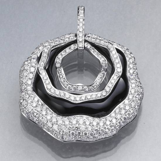 As shown is a piece of fine jewellery with quality diamonds and onyxes. Diamonds are arranged to form rings. Layers are there to create a three-dimensional feeling.