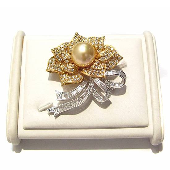 The featured jewellery is a 18K yellow and white gold brooch with diamond and pearl setting. It has a flower design with a South Sea pearl as its bud, while the yellow gold petals are set with round diamonds. The flower is also embellished with the white gold ribbon-like feature set channel set with baguette diamonds.