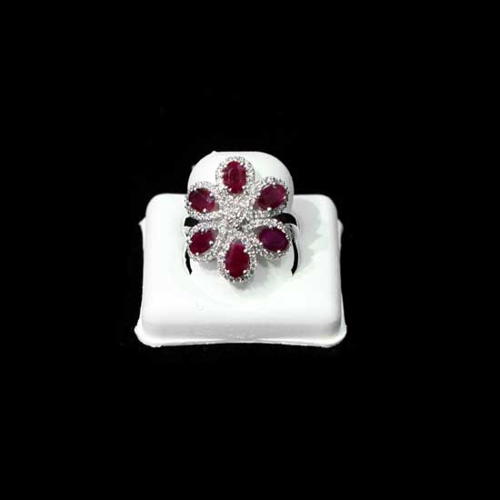 This white gold finger ring features a floral design and is adorned with 3ct ruby and 1.5ct diamond. The brilliant luster and the contrasting colors make this ring stand out from others. This charming finger ring is suitable for various occasions.
