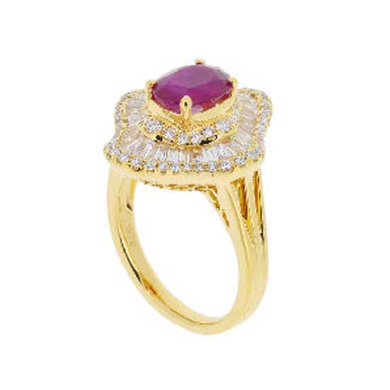 This finger ring clutches ladies' hearts instantly with its charming and deluxe appearance. It features an 18K yellow gold mounting which is inlaid with a cushion-cut ruby stone as the centerpiece. The sparkling paved white diamonds accent this ring for added value and uniqueness.