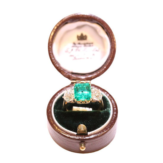This finger ring appeals to people with its deluxe and dainty appearance. It is inlaid with a green emerald in the center and two diamond stones. This stunning ring surely is a great item for adding some glamor to your slender finger.