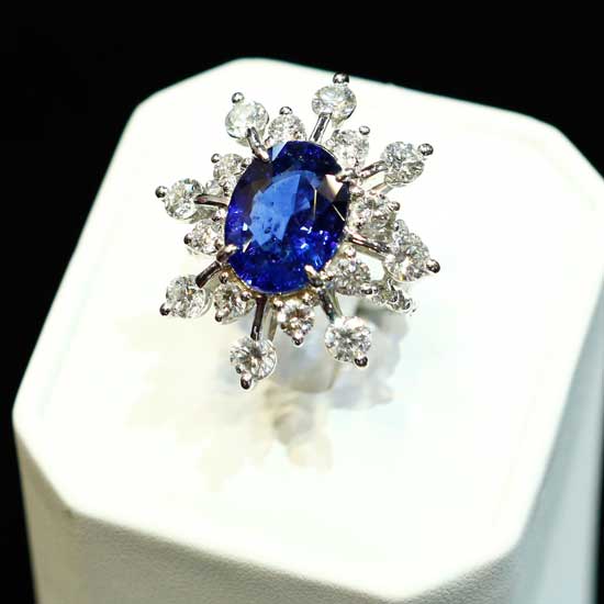 This finger ring appeals to people with its sparkling and deluxe appearance. It features a sapphire stone with an oval cut in the center. The ring is also adorned with shimmering diamond stones for added luxuriousness.