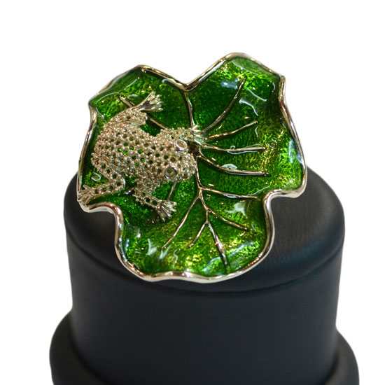 This is a finger ring that is made of 18-karat white gold and shimmers with a high-gloss finish. It showcases a cute frog crawling on the green leaf. This refined ring is an ideal addition to complete your jewelry box.