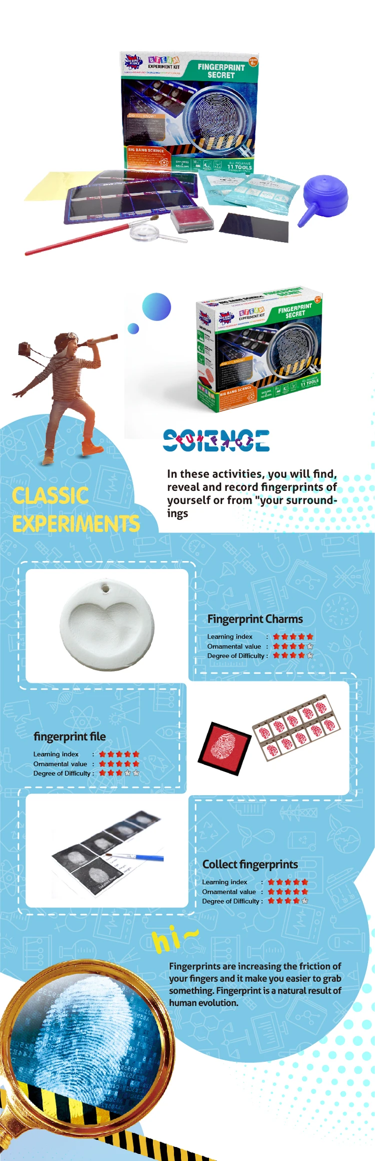High-quality educational toys: BIG BANG SCIENCE's fingerprint set is made of safe materials, environmentally friendly and non-toxic, in line with European and American toy safety standards, and has obtained safety certification from professional institutions. The highest quality hands-on science toys, all of our products are certified and backed by exceptional service.