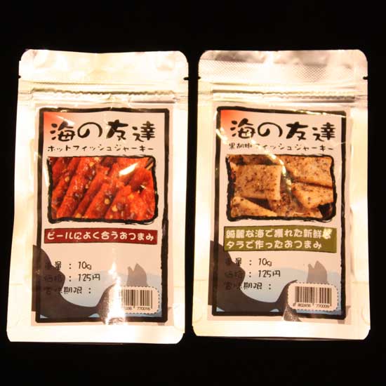 Showcased are two packs of fish jerky that come in hot and black pepper flavors. They feature a gratifying taste with a chewy texture. These delicious fish jerky make as a perfect afternoon snack and party food.