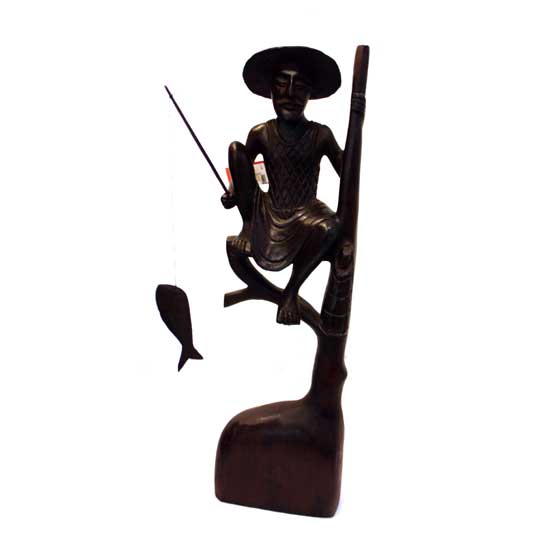 This exquisite decoration shows a fisherman fishing while sitting on a branch. The wooden piece features a deep brown surface. The attractive decoration goes well with different home settings.