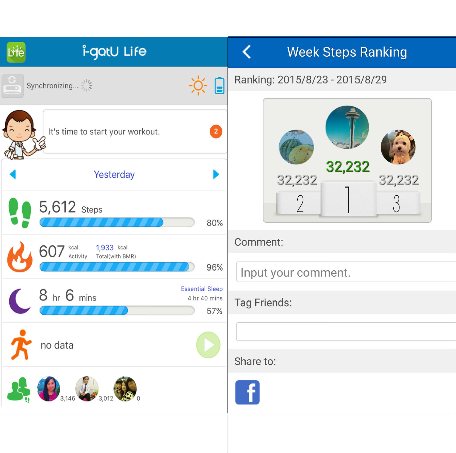 Fitness pal and daily/ weekly competition of steps, distance or calorie. compete/ interact/s hare with friends to keep motivated.