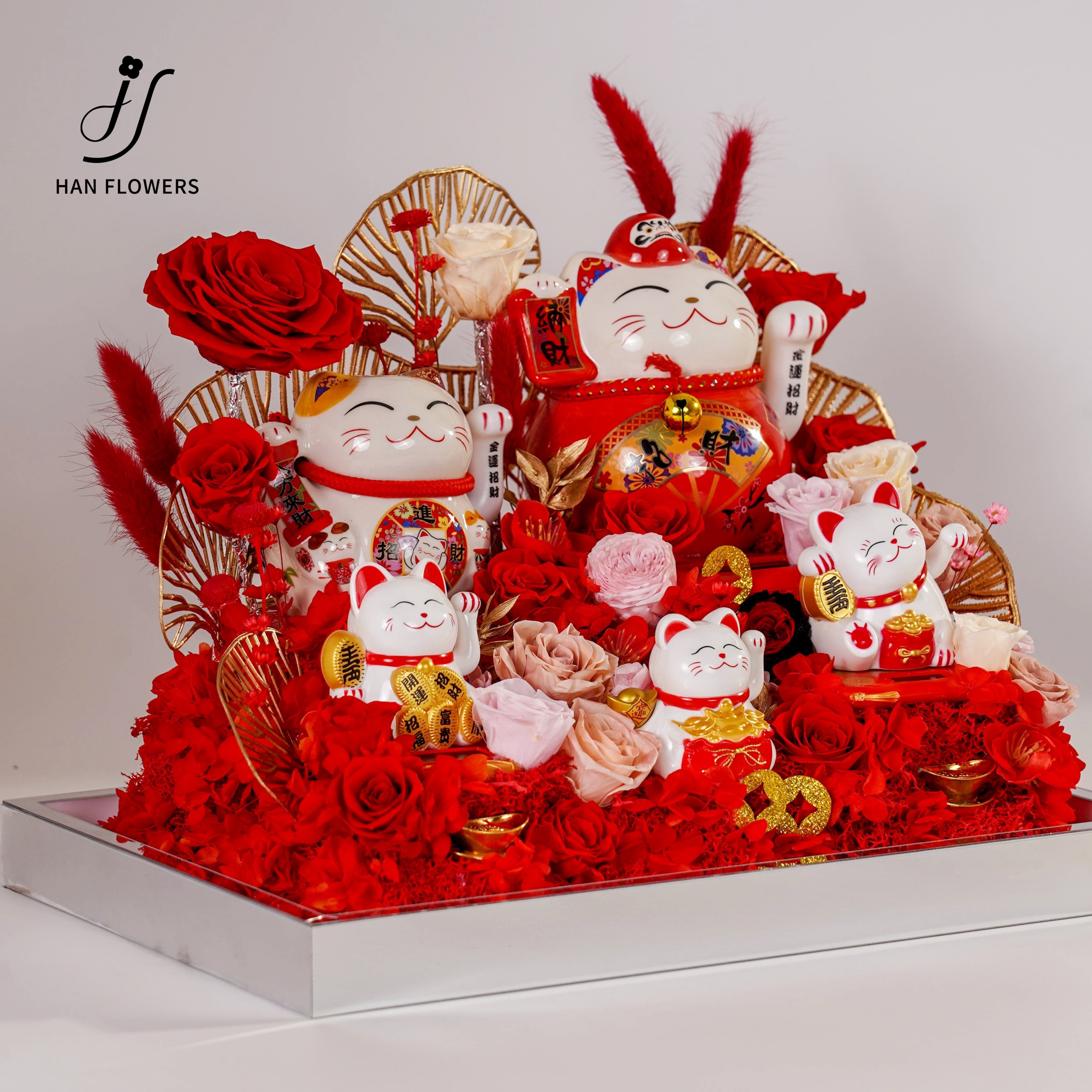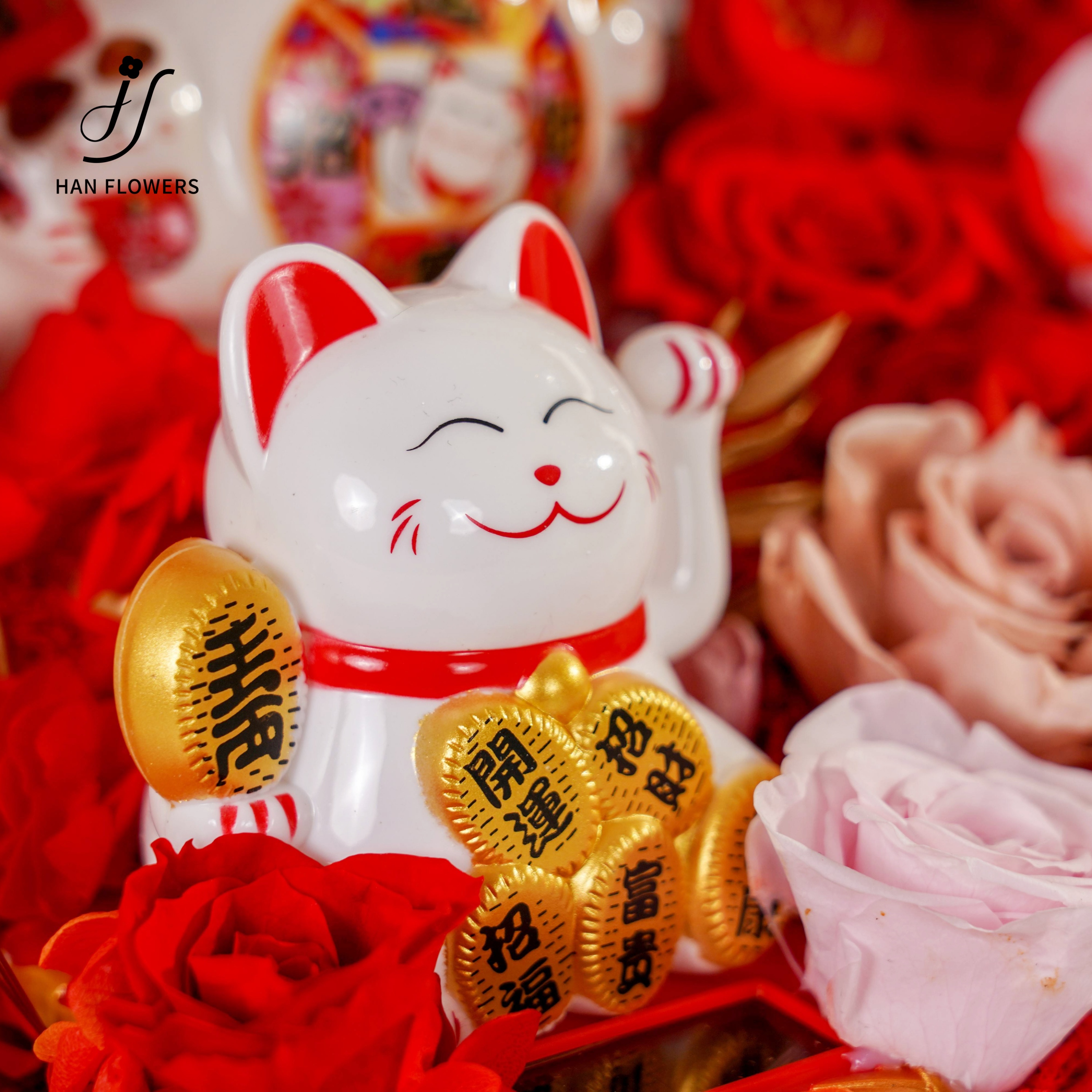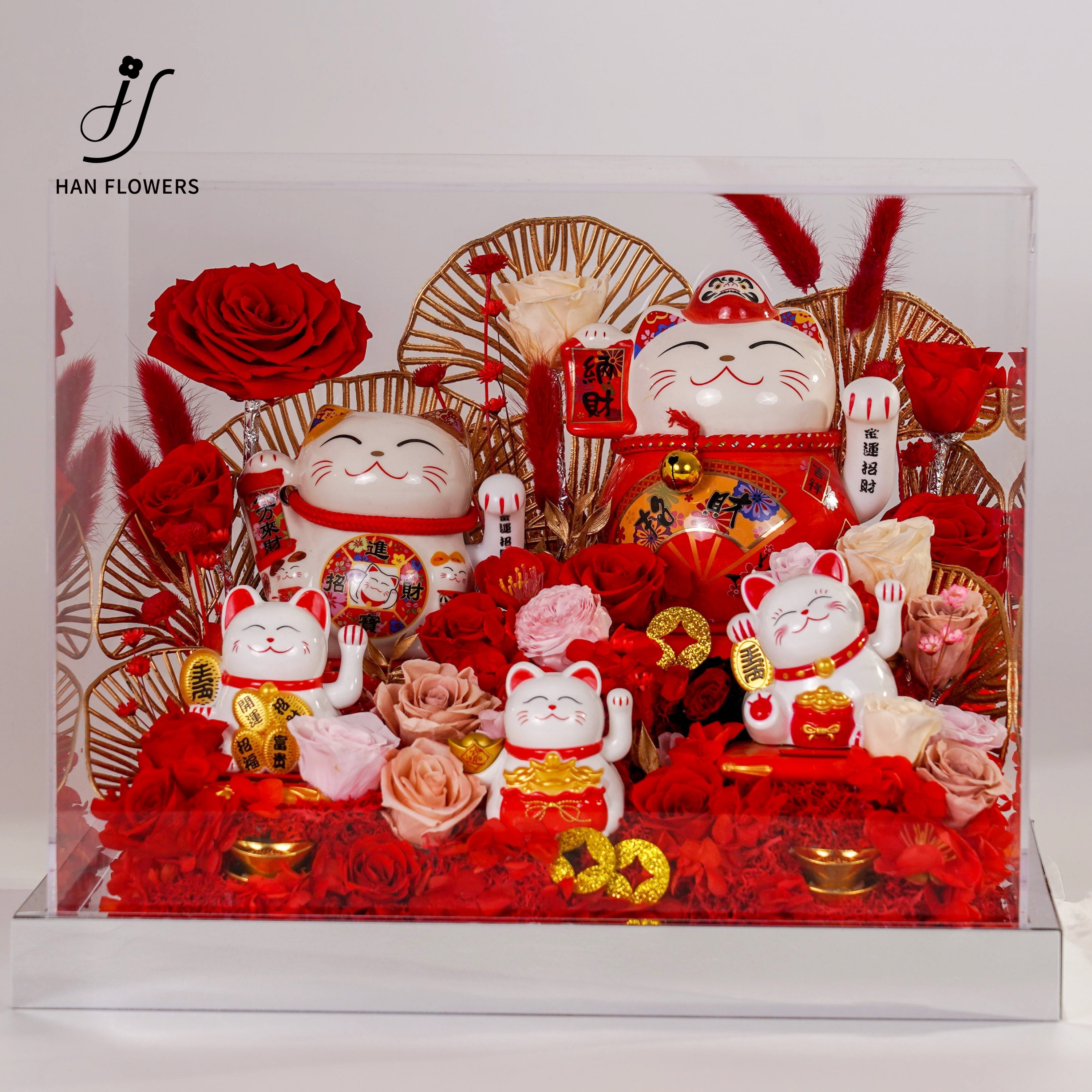 Five blessings come to the door beckoning cat, rose immortal flower ornaments, opening housewarming, friends, elders, gifts With flowers that never wither, five beckoning cat ornaments are placed in a staggered manner to attract good fortune