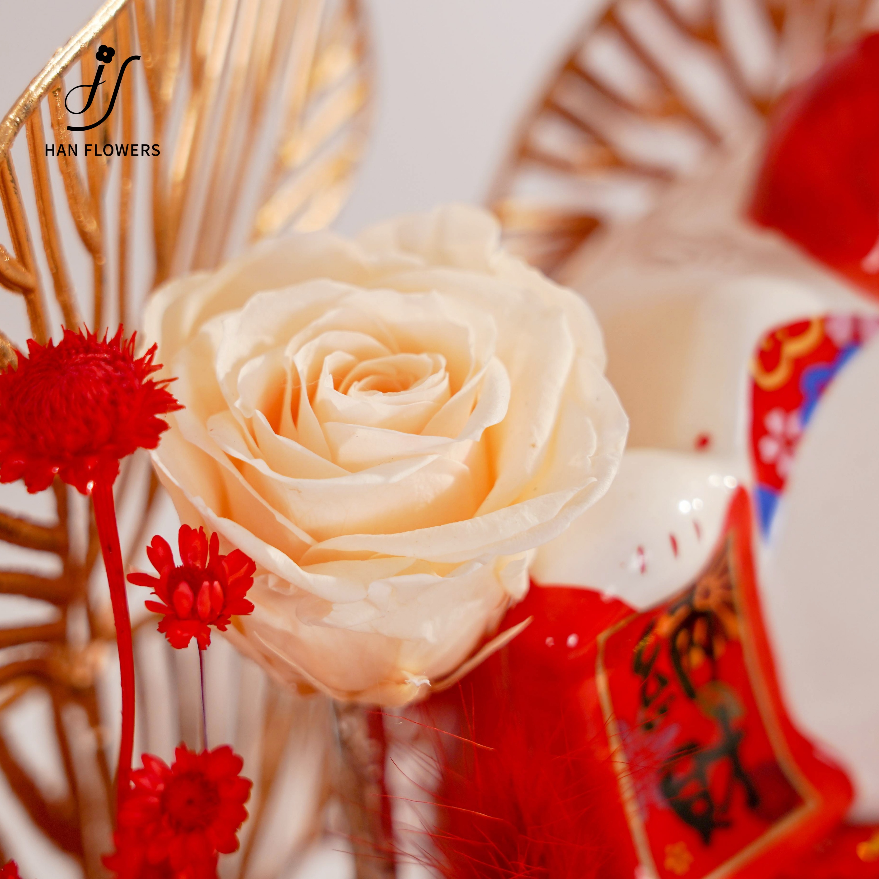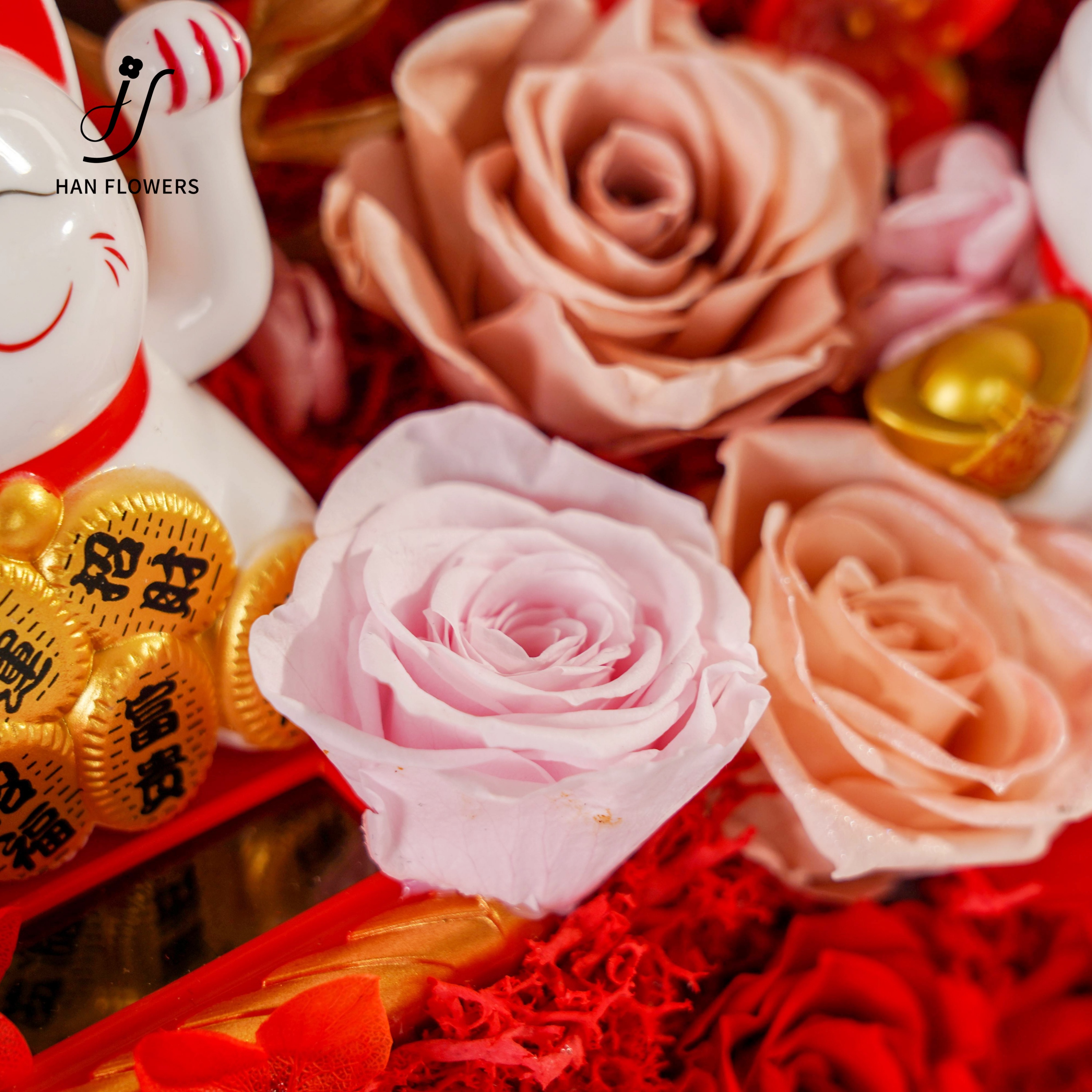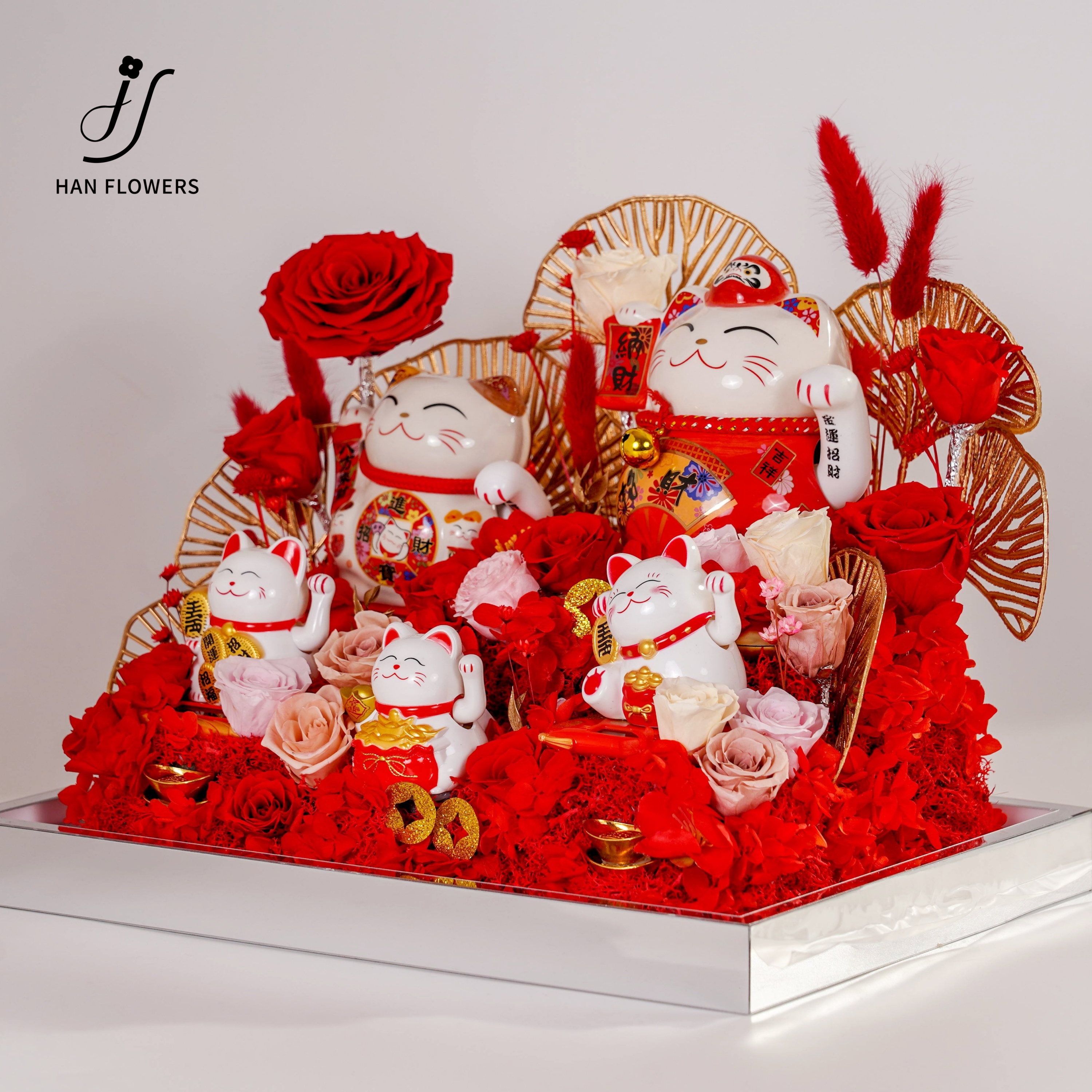 Five blessings come to the door beckoning cat, rose immortal flower ornaments, opening housewarming, friends, elders, gifts With flowers that never wither, five beckoning cat ornaments are placed in a staggered manner to attract good fortune
