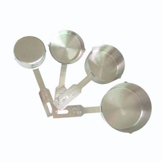 This is a set of flat handle measuring cups with 4 different capicities. They are made in stainless steel which are durable for long term use. The handles of the cups have holes for linking together for easy storage.