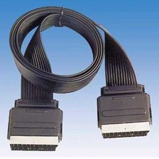 This is a flat SCART cable ideal for transferring bi-directional video and stereo audio signals between TVs, DVDs, VCRs, digital TV receivers and digital satellite receivers. The PVC outer jacket surrounds the total length of each THOR interconnect cable for protection from abrasion, damage and deterioration. This 21-pin male-to-male flat SCART cable is a great addition to your home entertainment system.