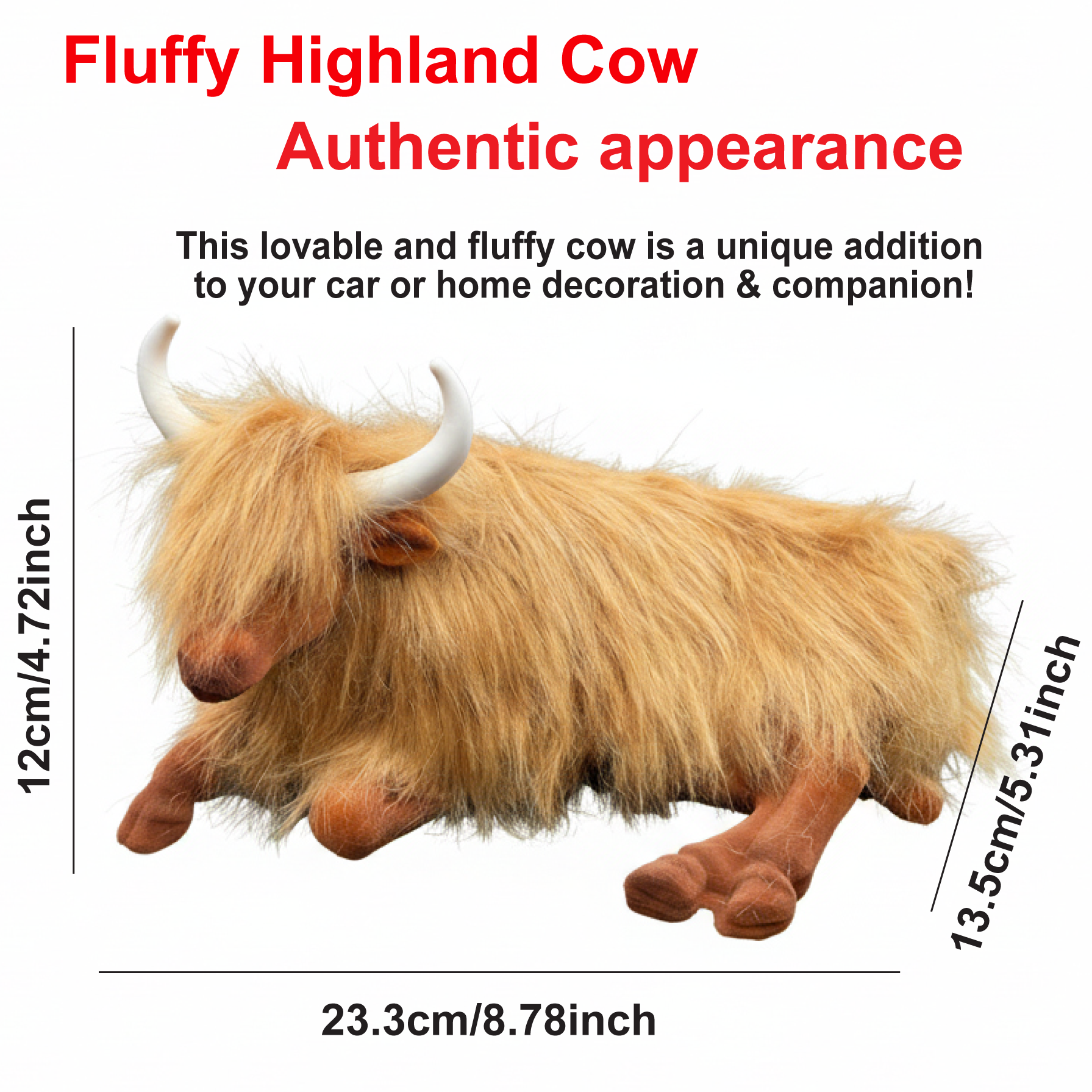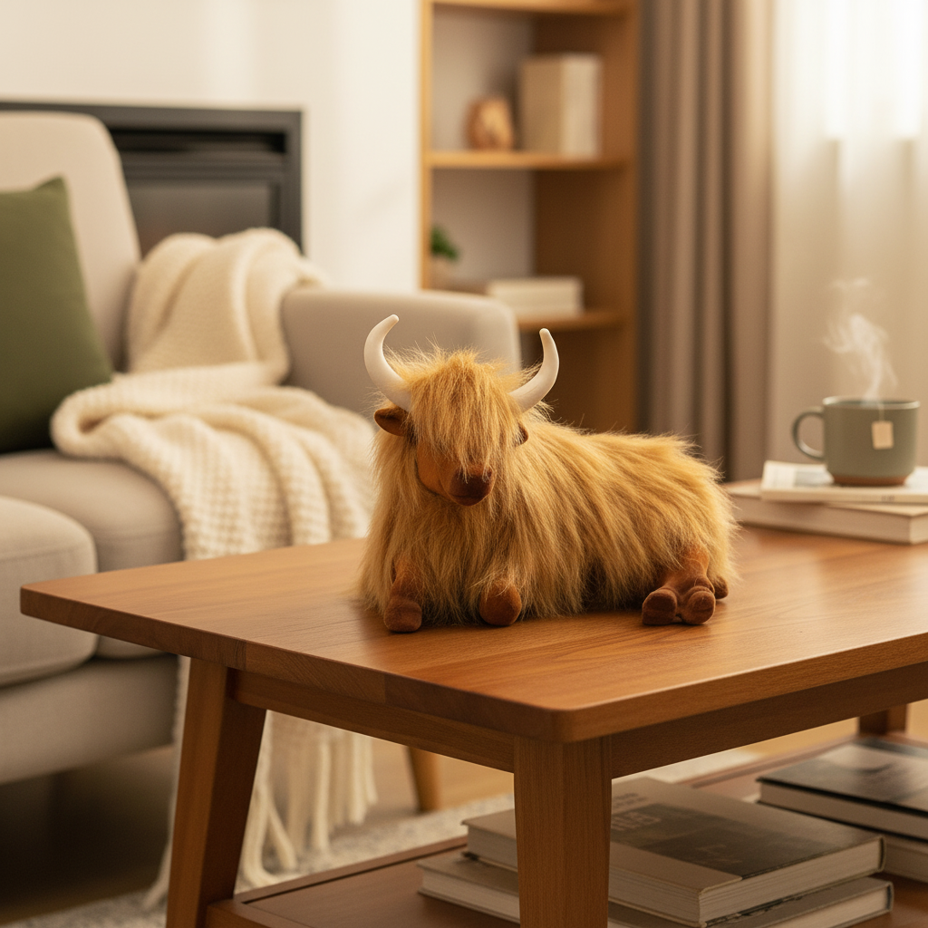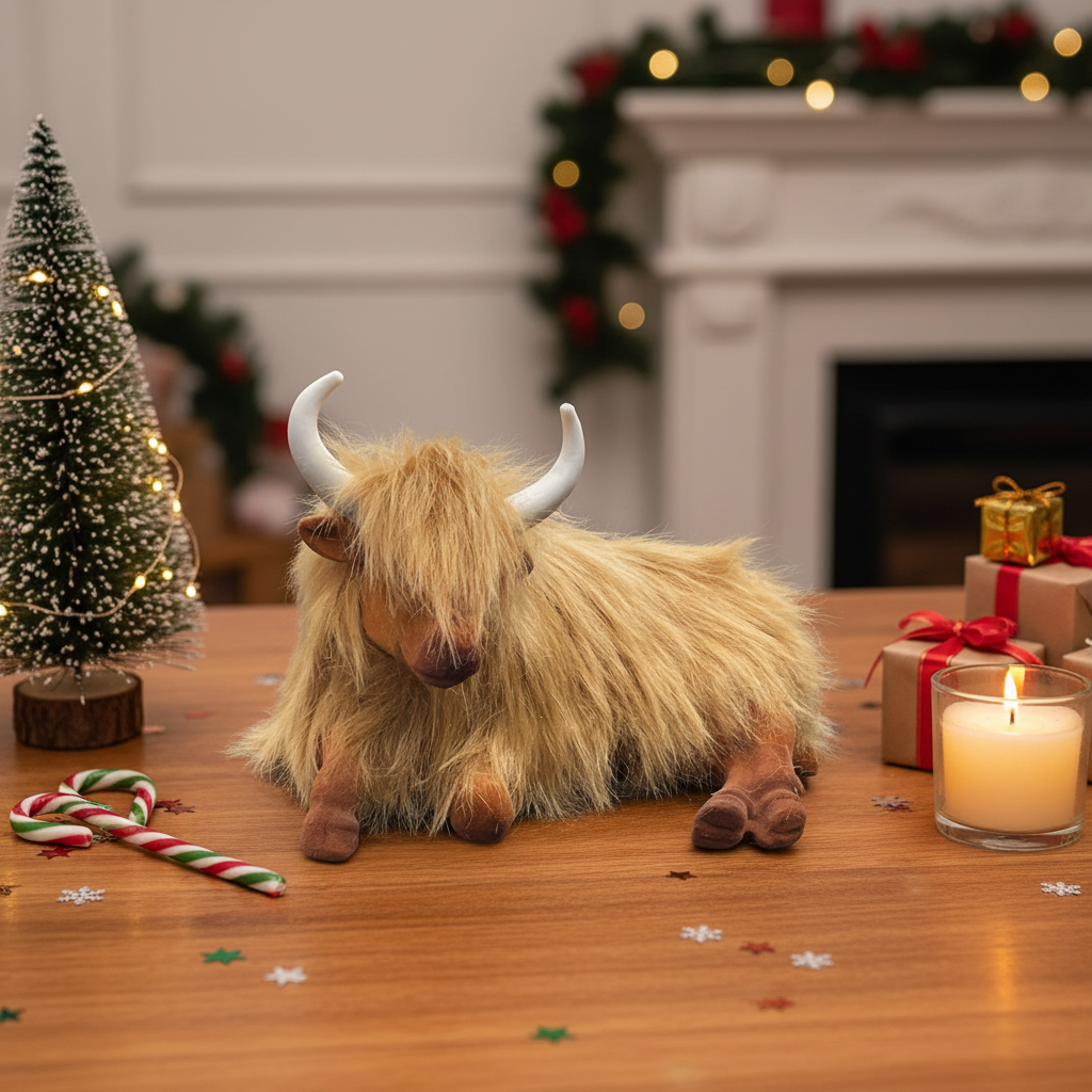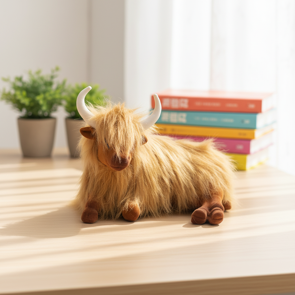 This is an incredibly adorable Highland cow. Its features—fluffy long hair, curved long horns, the "bangs" covering its eyes on the forehead, and its sturdy, reclining posture—are all meticulously crafted, perfectly capturing the genuine, endearing, and slightly goofy appearance of the real breed.
