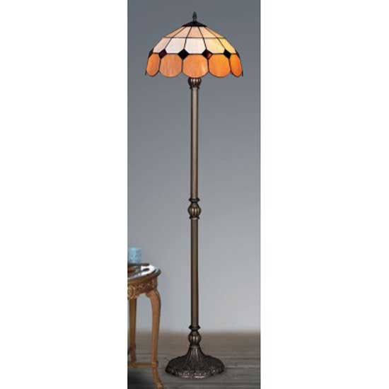 This elegant floor lamp comes with a classic and decorative pedestal. It is adorned with an orange lampshade designed in a Tiffany style. Elaborate floral patterns on the pedestal base look beautiful in any room.