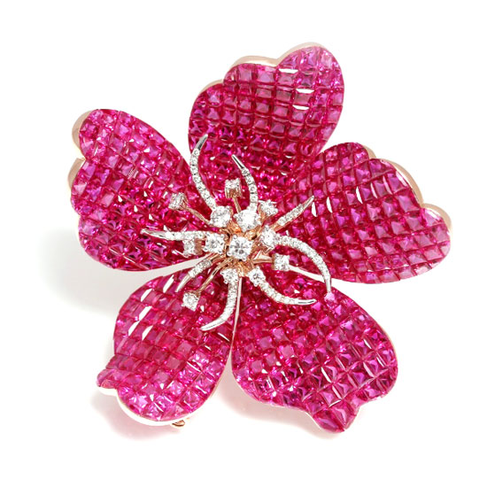 This is a five-petal flower brooch that truly embodies striking beauty. The invisible-set rubies encrust the petals for impeccable glamour. The diamond stigma enriches the design with its sparkling white glints.