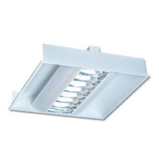 This is a white fluorescent lamp ceiling fixture characterized by its modern-looking and square exterior. A main feature of the fluorescent lamp fixture is its aluminium reflectors and perforated diffusers. This ceiling fitting is recessed, imperial and metric.