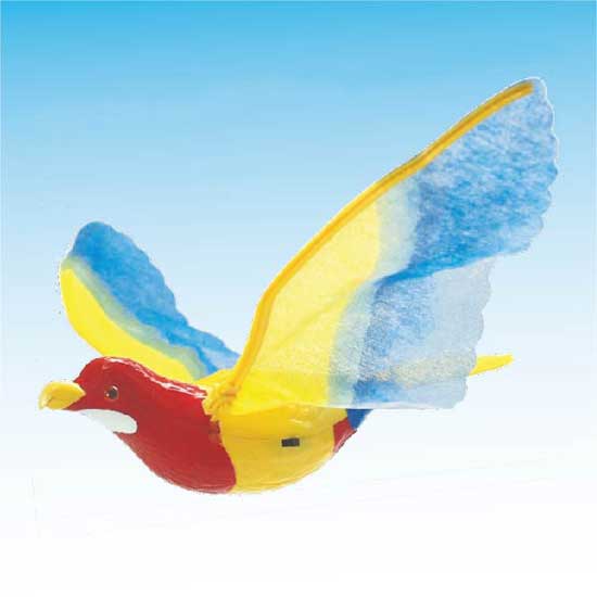 This flying Rosie Rosella features a red and yellow body with yellow and blue sheer wings. It is powered by two AA batteries. This interesting flying toy is sure to give you loads of fun.