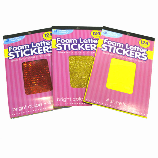 The picture displays three packs of foam letter stickers with a glittering accent. Each pack includes 4 sheets, 124 stickers of various designs. It makes an ideal accessory for kindergarten or primary school art and craft projects.