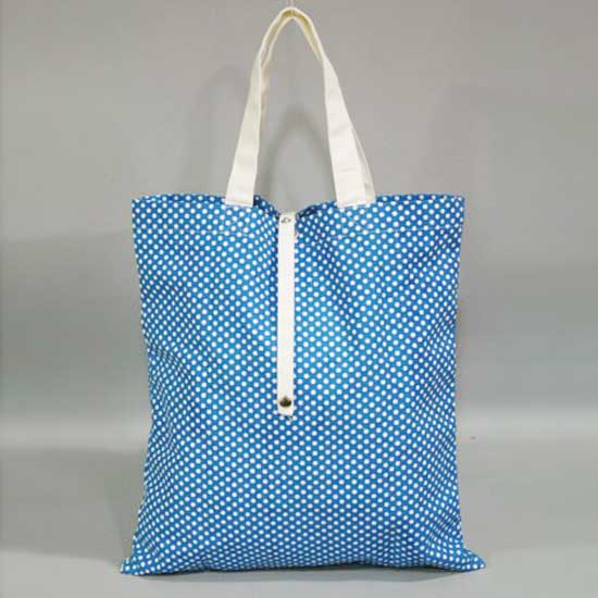 This fold-up bag is made of canvas that has not been laminated. It features allover white dots on the blue background for cuteness. This foldable bag is easy to carry and store.