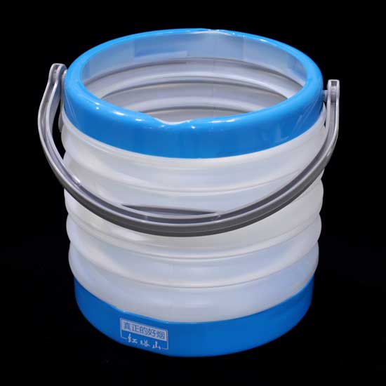 This is a plastic foldable bucket that can be used for fishing in a round shape. The body of the bucket features a two-tone style with the combination of white and blue colors. The ergonomic handle allows for an easy and comfortable grip.