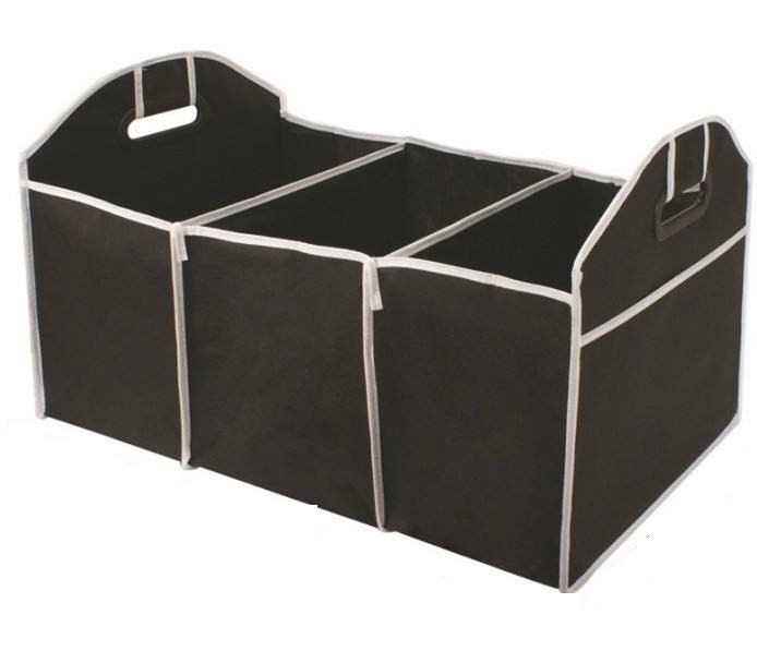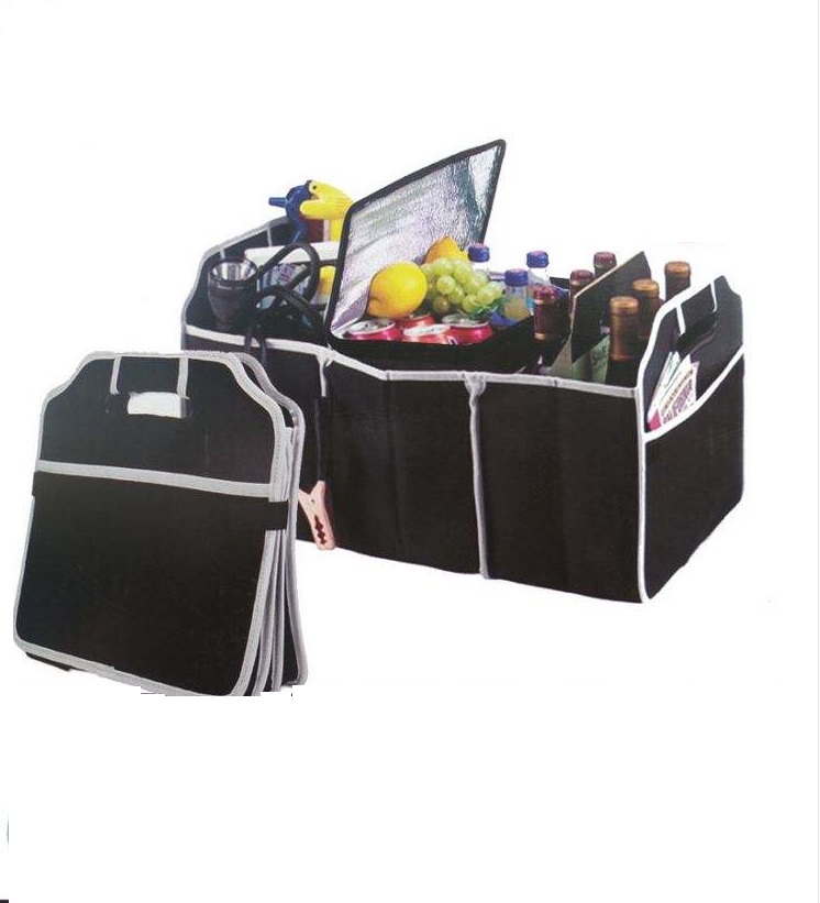 Foldable Storage Organizer bag, with two regular compartments , a compartment with insulated lining to keep cold stuff and have two flat slip pockets.