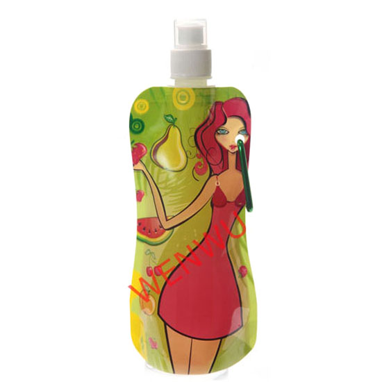 This stylish water bottle comes with a foldable design for added convenience. It is designed with colorful prints for an attractive look. This foldable water bottle with a carabiner can be attached to a bag.