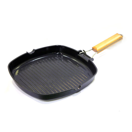 The outlined cooking pan is specially designed for grilling use. The die-cast aluminum construction allows durable use. This folding grill pan comes with a foldable handle for easy storage.