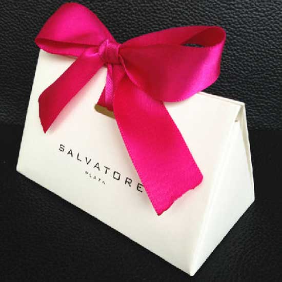 This folding white paper bag features a triangular prism design. The stylish paper bag is accented with a festive red ribbon bow on the top. The paper bag is available in any size to suit your needs.