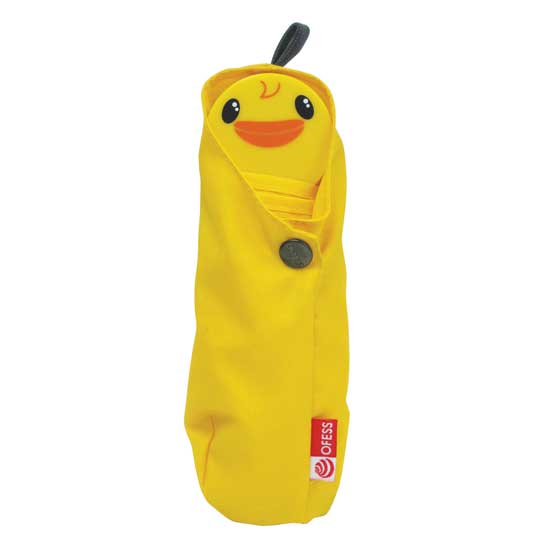 This is a folding umbrella with a captivating lemon yellow hue. It features a cartoon duckling-shaped handle for a sense of loveliness. The displayed folding umbrella is easy to carry around.