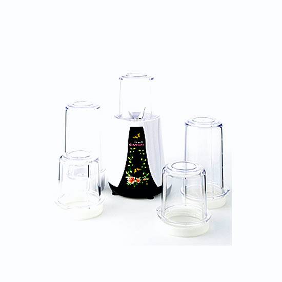 This classy set consists of an electric mixer, 2 large cups and 3 small cups. The high-performance motor provides great convenience for mixing different food types. This versatile mixer can also perform functions of a crusher and a juicer.