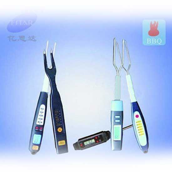 Displayed is a food thermometer that can be used easily. A sound will be given out to signal cooked or uncooked meat. This food thermometer is used for indoor or outdoor cooking.