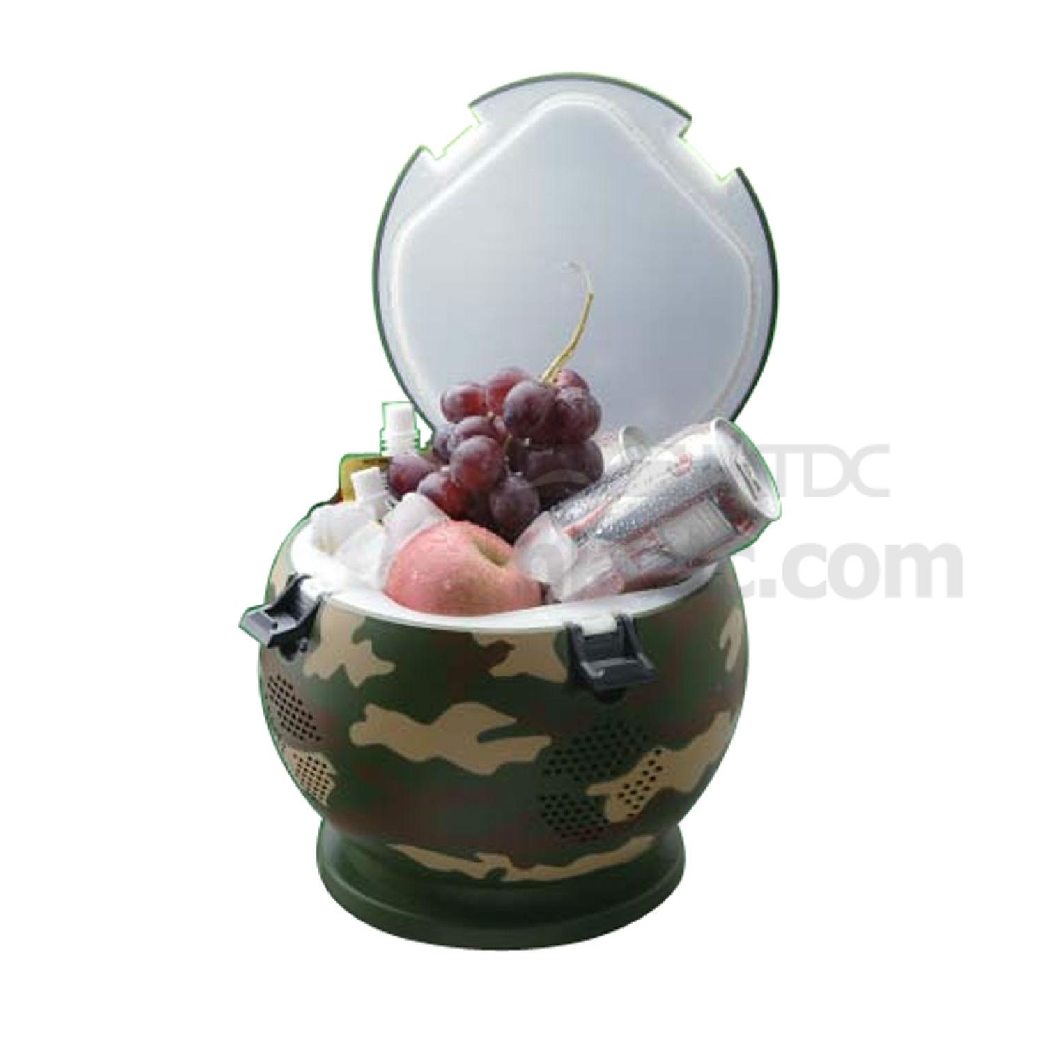 This is a football-shaped cooler with the functions and radio. It can carry a maximum of 6 cans.