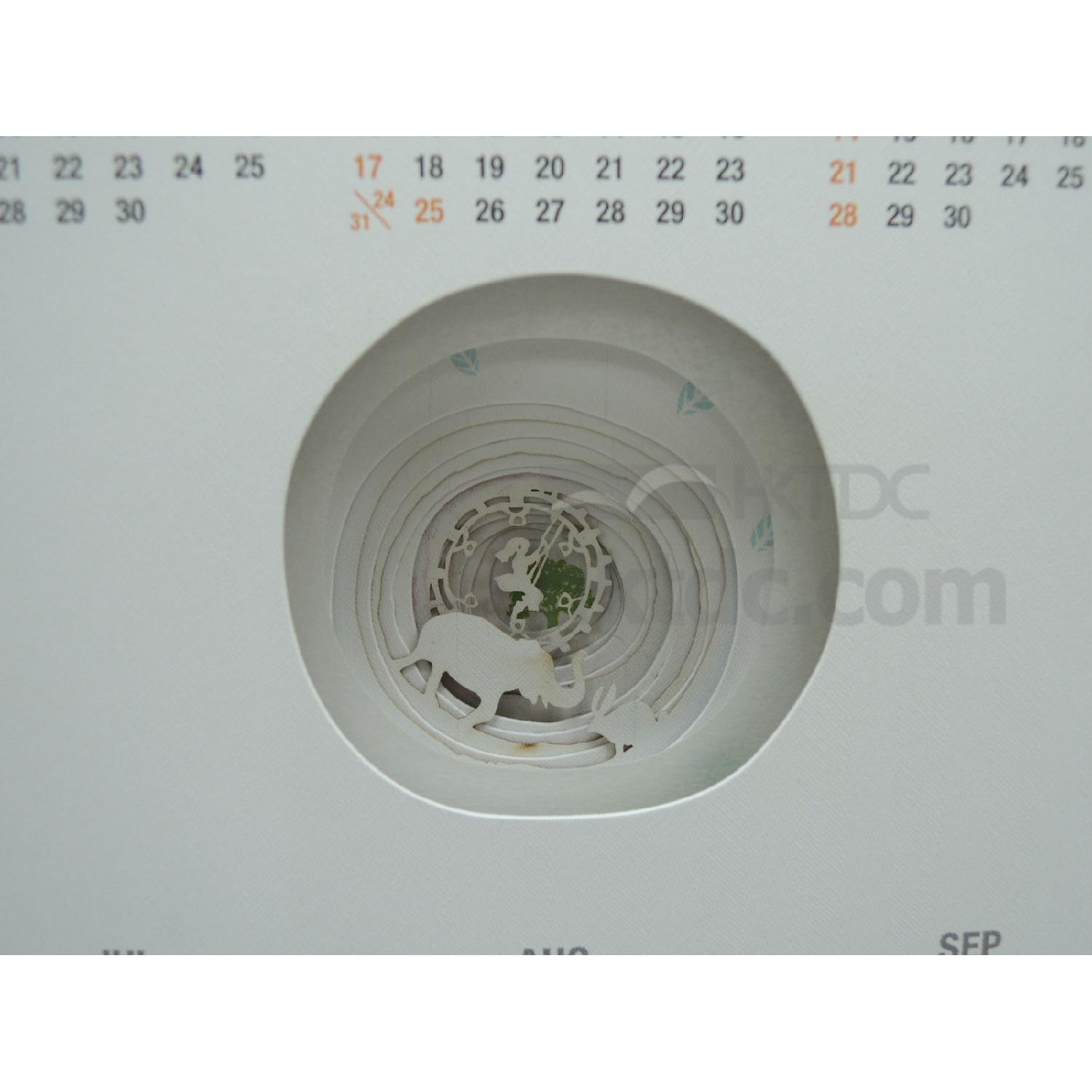 This year our Theme is Time Capsale, when start to open the calendar, you can see the growth ring, we use Laser burn and foil to show this area, let customer can easy to see our brand; than turn to inside, we are design the middle to laser burn the story in there, ( from start animals and human should be peace together, beucase we are live together in Earth ) ; than use the wood patten for the stand design.