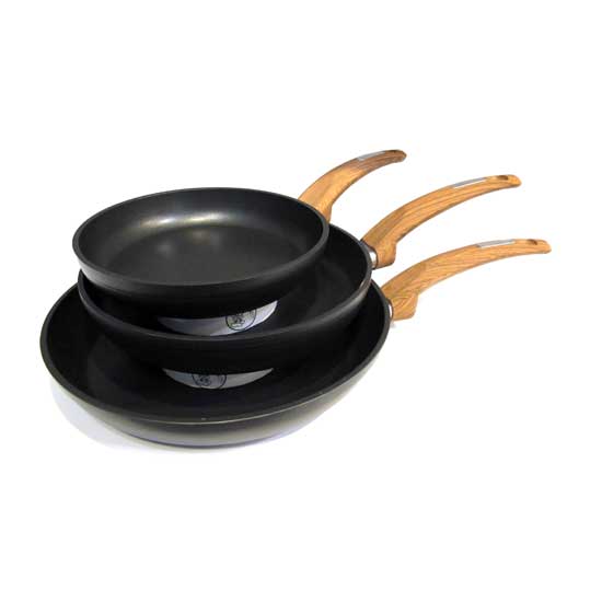 This forged frying pan in black is made of aluminum alloy for durability. It is fitted with a wooden silicone handle for attractiveness. This practical frying pan is available in different sizes.