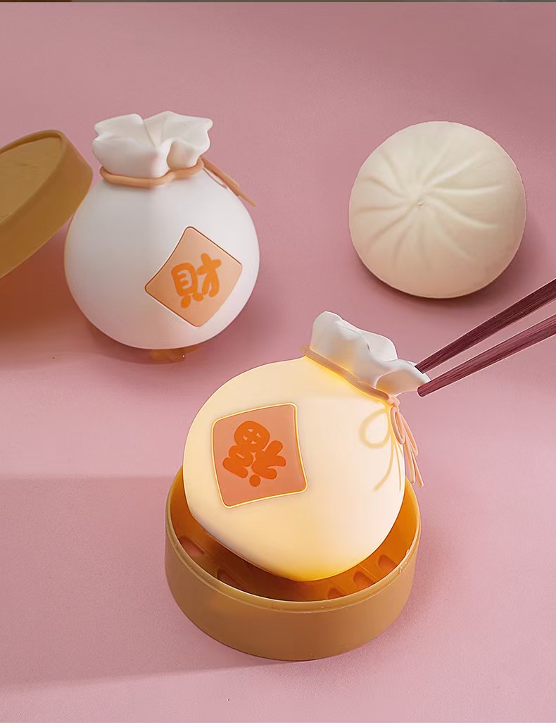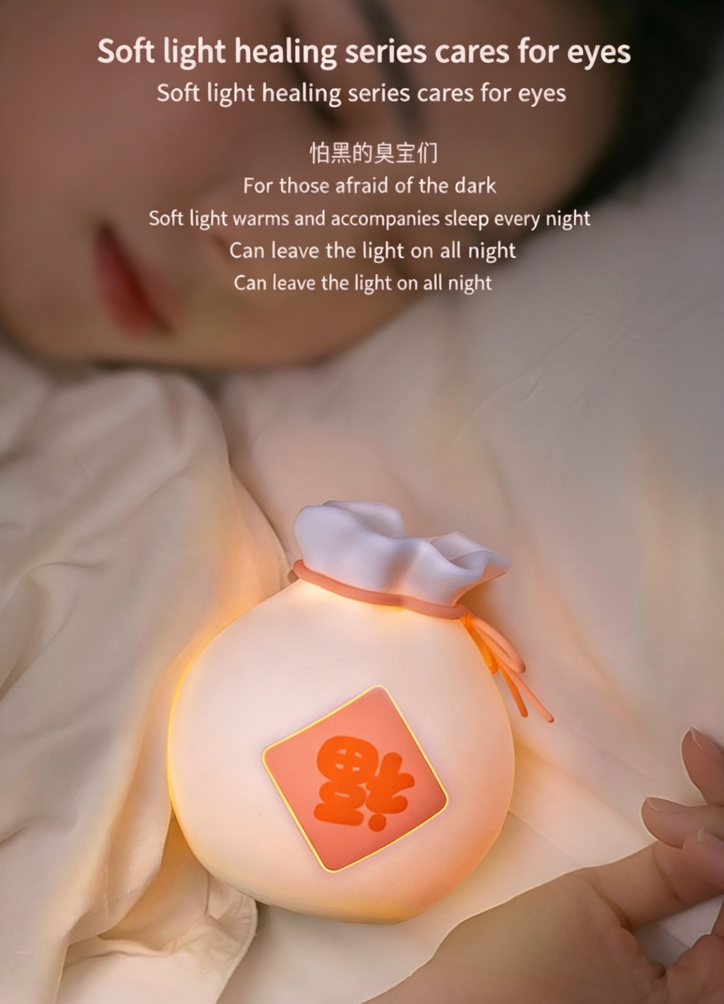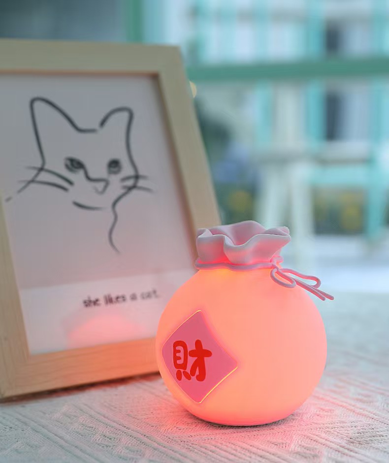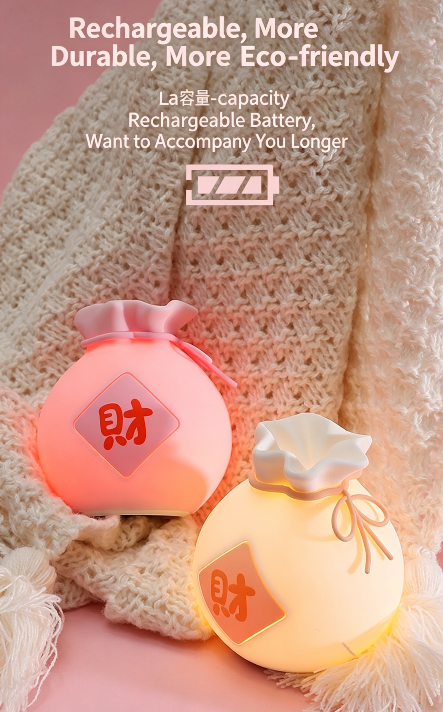 This cute Fortune Bag Silicone Night Light is a perfect blend of traditional Chinese culture and modern convenience. With soft tap control, 2 brightness levels, auto-off timer, and 1200mAh rechargeable battery, it provides warm, eye-friendly light for bedroom, nursery, and desk.