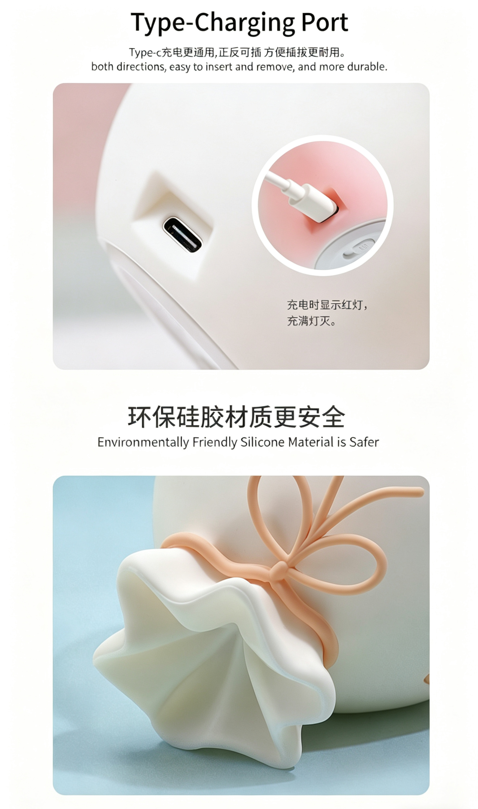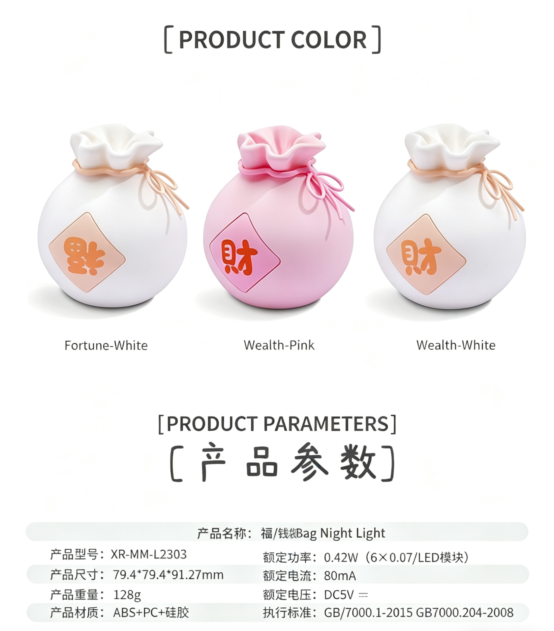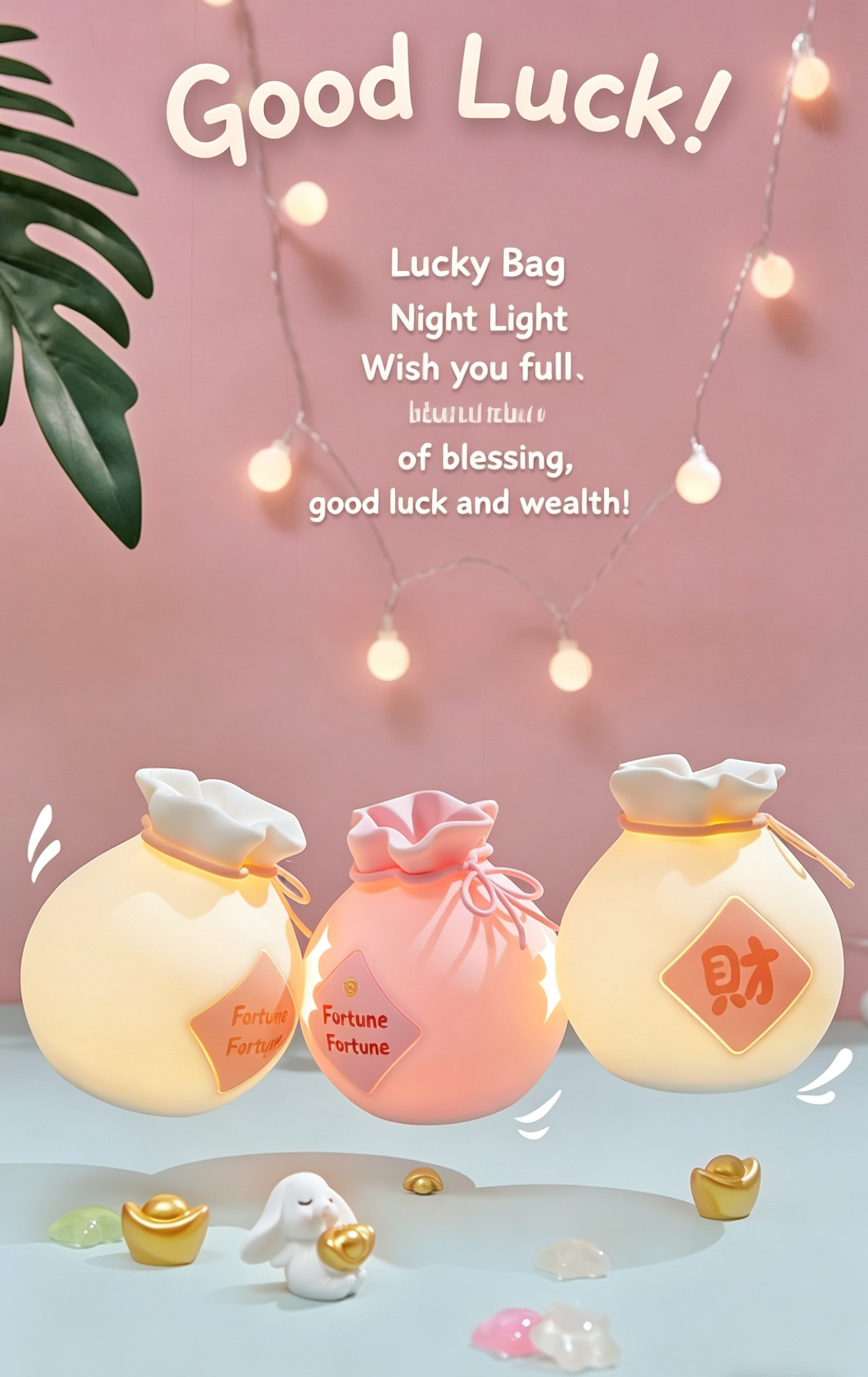 This cute Fortune Bag Silicone Night Light is a perfect blend of traditional Chinese culture and modern convenience. With soft tap control, 2 brightness levels, auto-off timer, and 1200mAh rechargeable battery, it provides warm, eye-friendly light for bedroom, nursery, and desk.