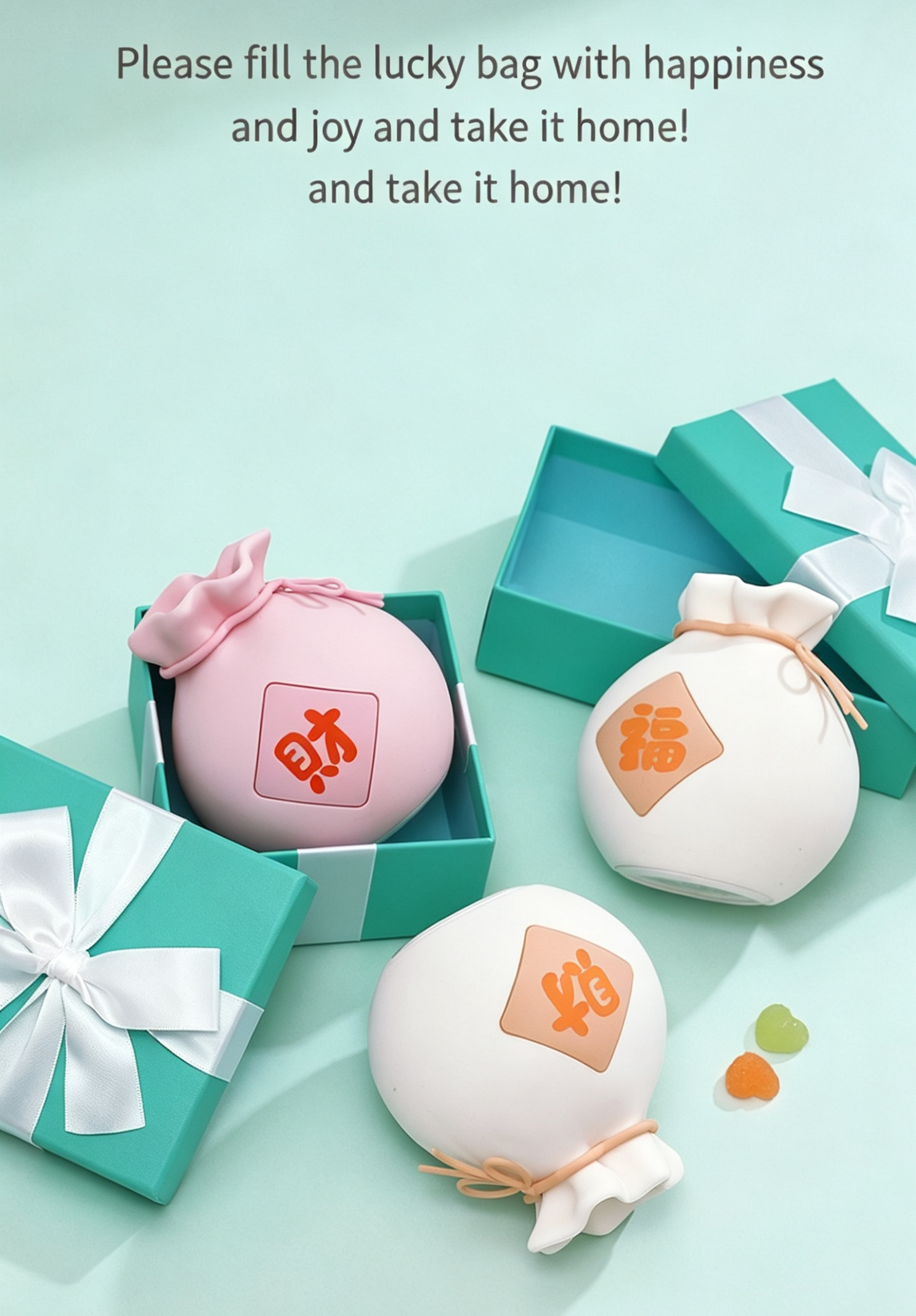 Adorable traditional Chinese fortune bag shape with "Fortune/Wealth" motifs, soft squeezable silicone, doubles as a stress-relief toy, great for festive gifting.