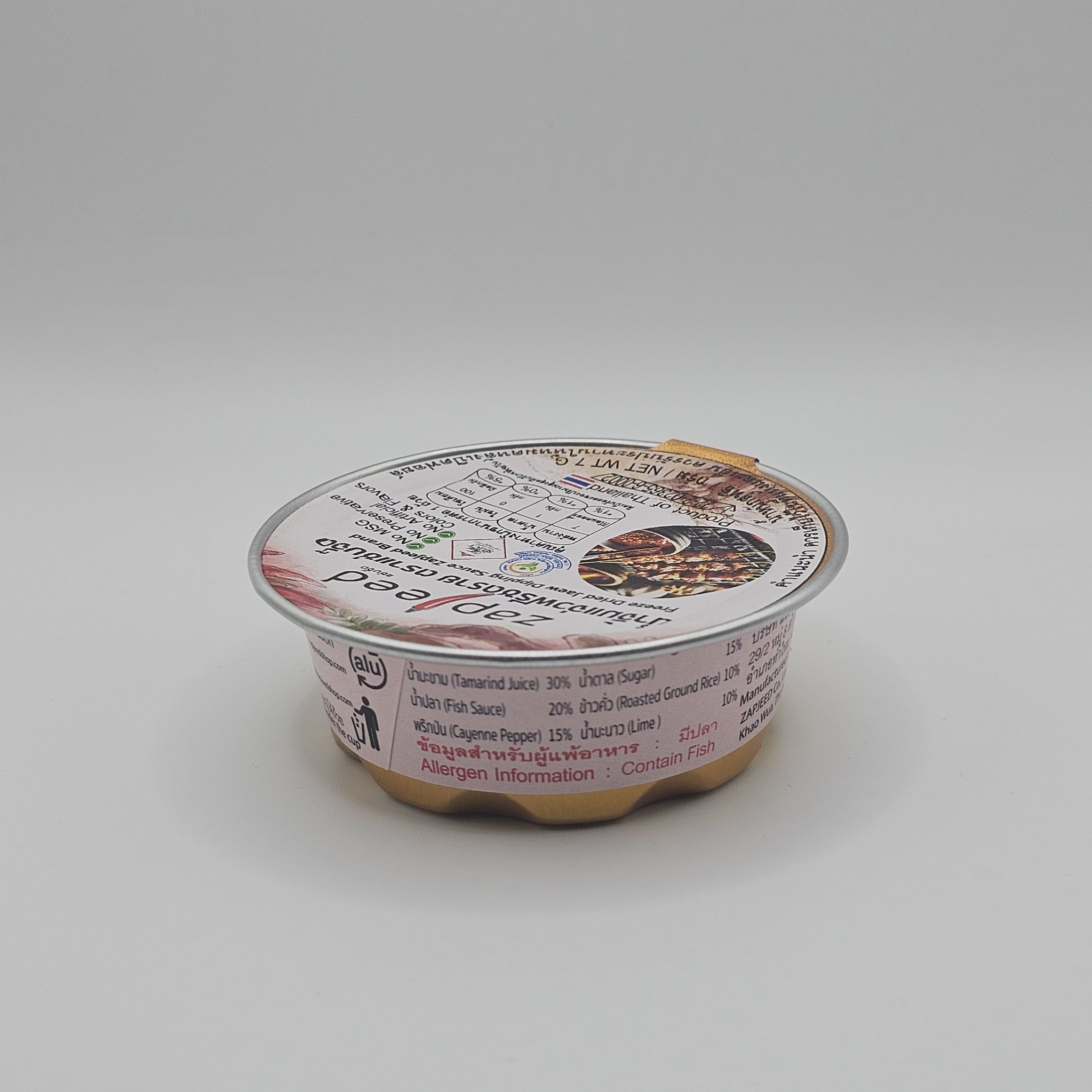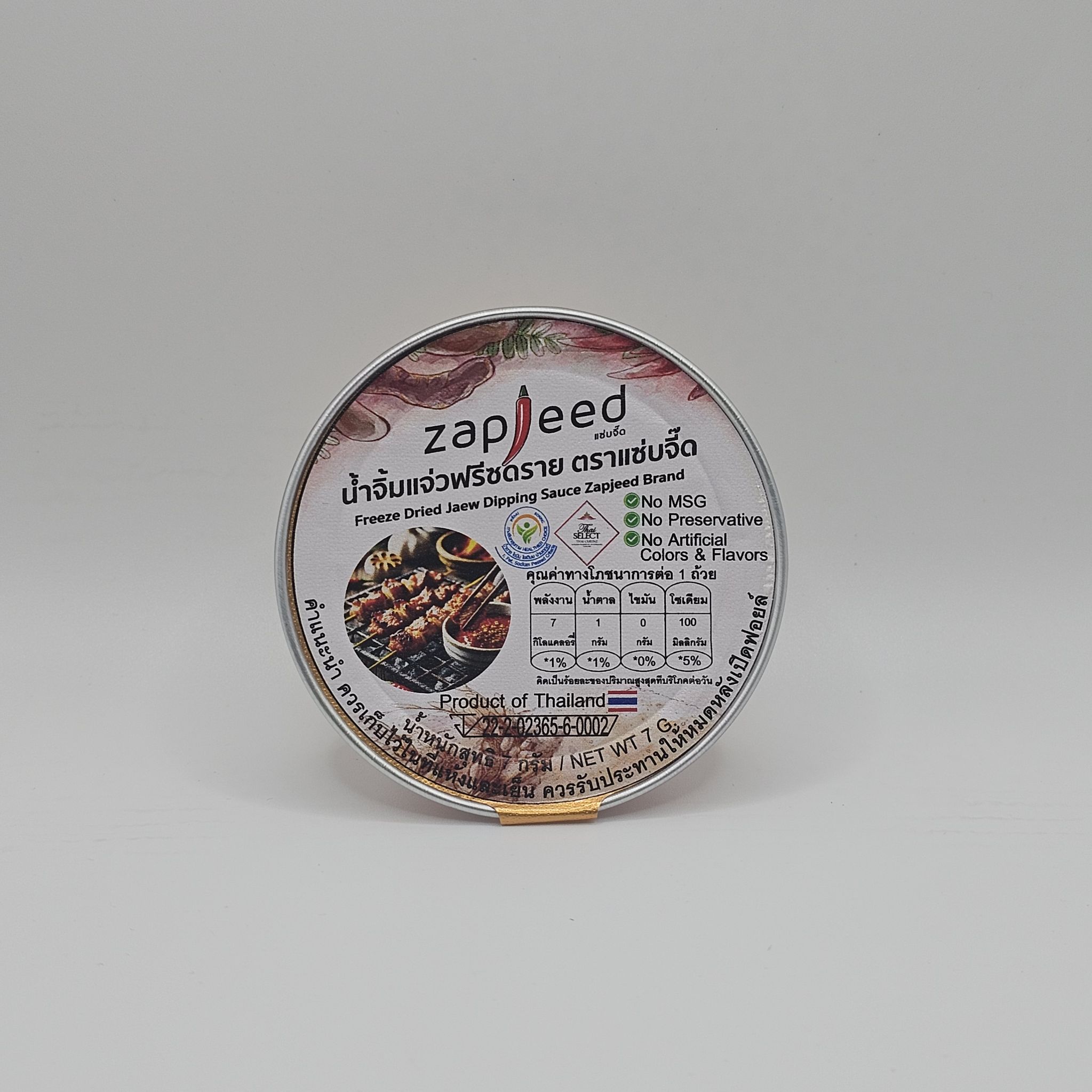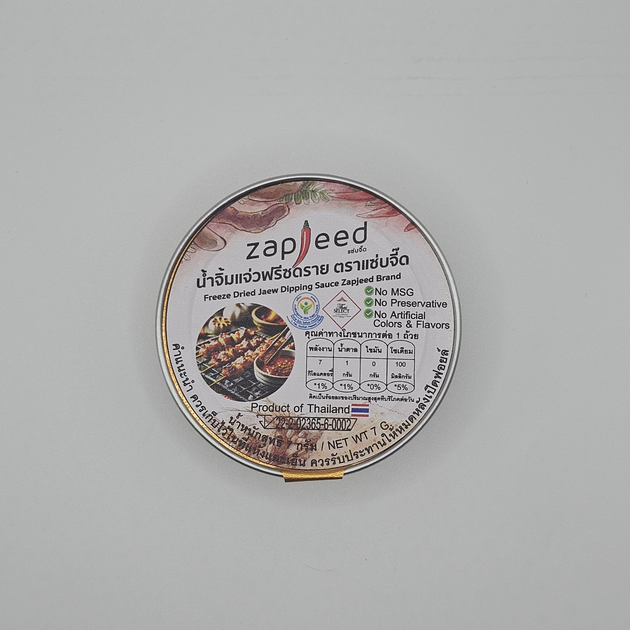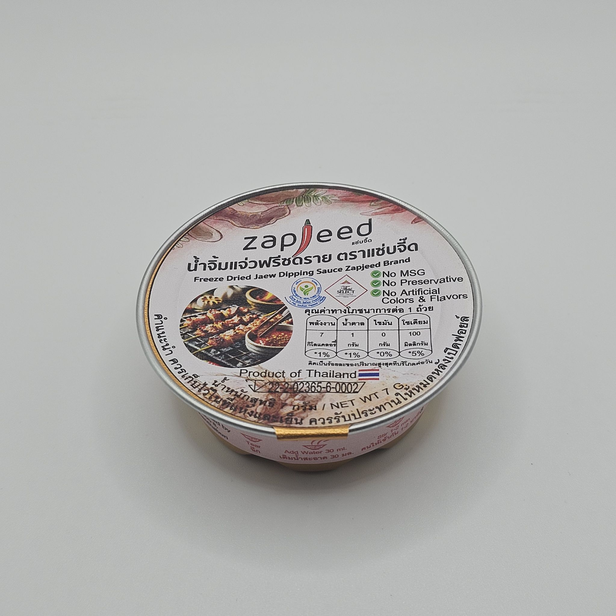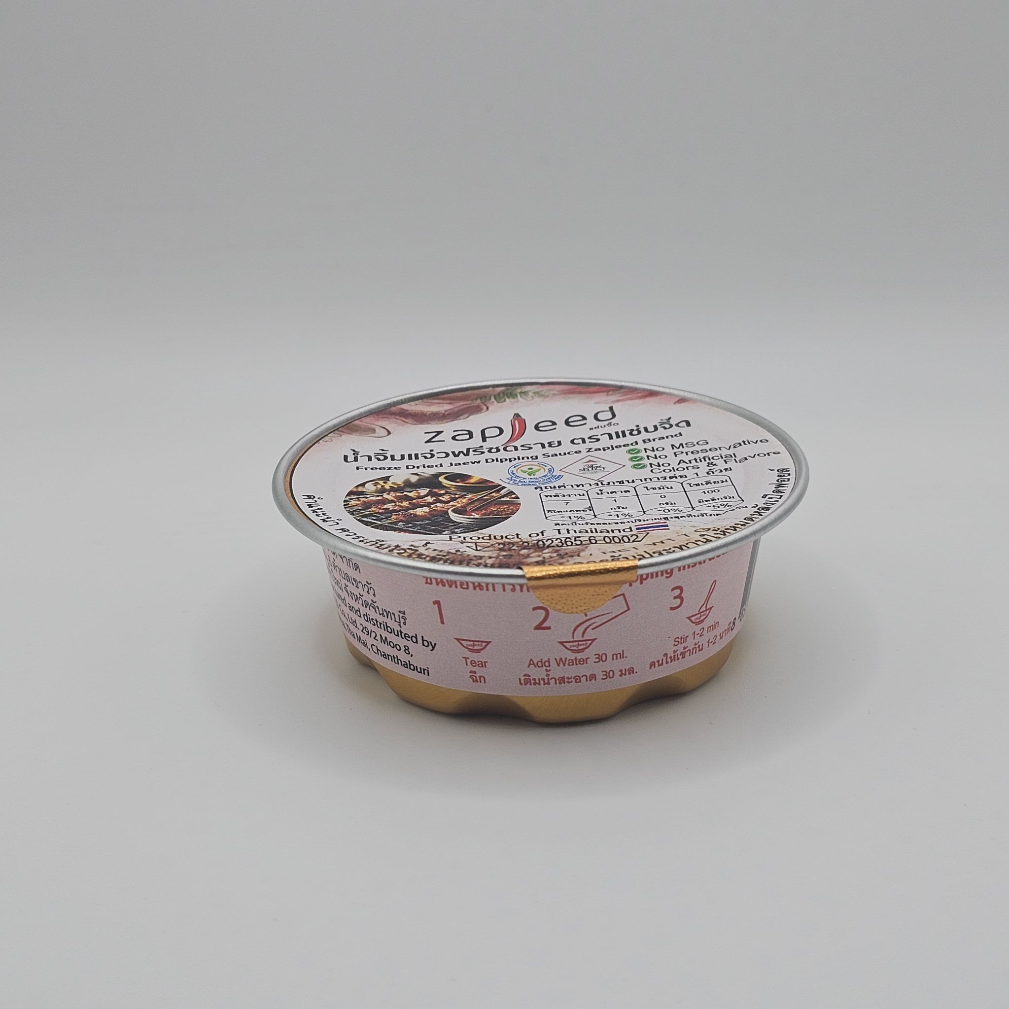 ZAPJEED’s Jaew dipping sauce, presented in a 7-gram aluminum foil cup, captures the bold and distinctive flavors of Northeastern Thailand (Isan). This signature blend features the rich, smoky heat of dried chili, the tangy brightness of fresh tamarind juice, and the aromatic depth of toasted rice powder.