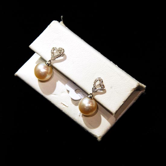 The diamond earrings feature two plump and glossy Fresh Water pearls as ornaments. Each of the earrings is completed with a heart-shaped clasp for enhanced appeal. The clasps are also complemented with glittery small diamonds.