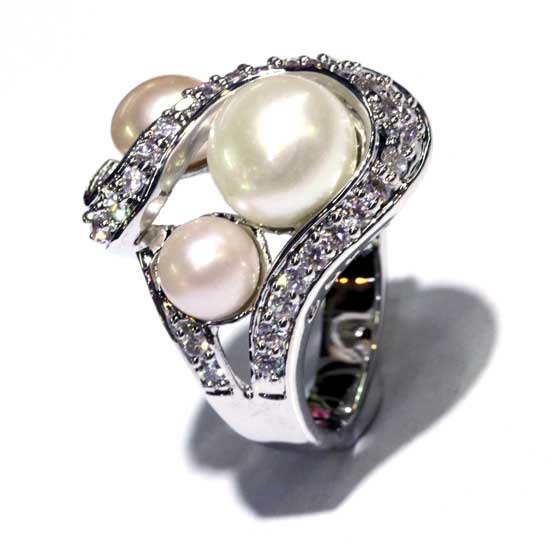 The exquisite 925 silver ring features a streamlined design in a brushed finish. It is encrusted with three fresh water pearls and clear CZ stones for a glistering touch. Accessorize an elegant evening look with this gorgeous ring.