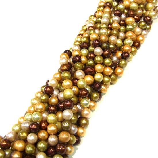 These are temporarily strung fresh water pearls for making jewellery, especially pearl necklaces. They are round and near round in shape and are in assorted dyed colours, such as white, green, yellow and brown.
