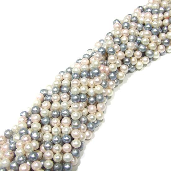 These are temporarily strung fresh water pearls for making jewellery, especially pearl necklaces. They are round and near round in shape and are in assorted dyed colours, such as white, pink and greyish blue.