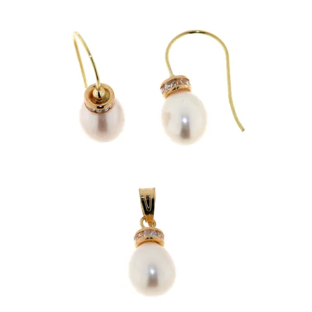 The jewelry set flaunts an exquisite design with delicate craftsmanship. The nicely polished freshwater pearls are paired up with gold hooks to add an elegant touch. These pearl jewelry pieces are ideal for attending formal occasions such as weddings and banquets.