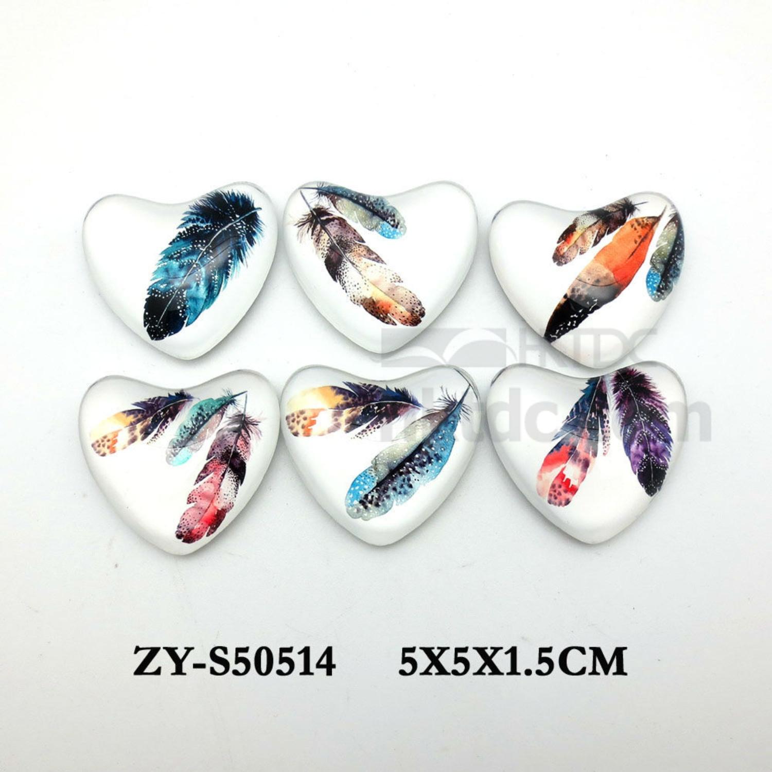 Heart shape feather printing crystal glass fridge magnet, custom magnet