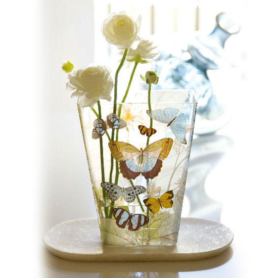This is a fringe vase that is accented with allover butterfly patterns for a decorative touch. It is used to keep fresh flowers in good condition. This fringe vase offers long-lasting durability.