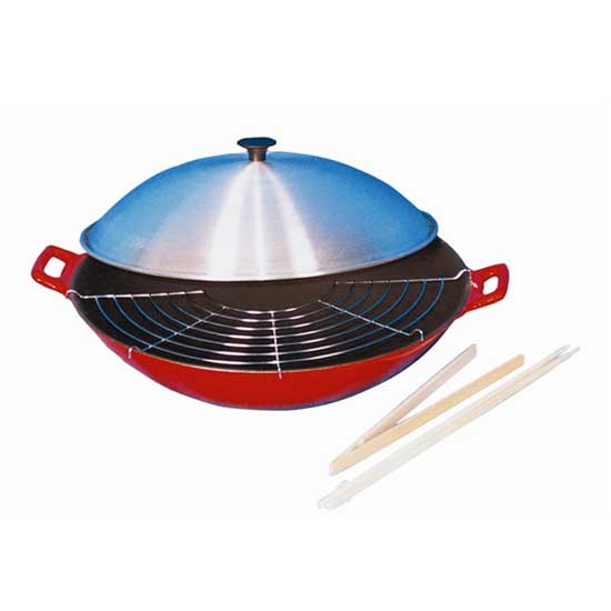 Displayed here is a frying pan cast in iron. It comes with a matching cover in a silvery color. This frying pan is highly durable and easy to clean.