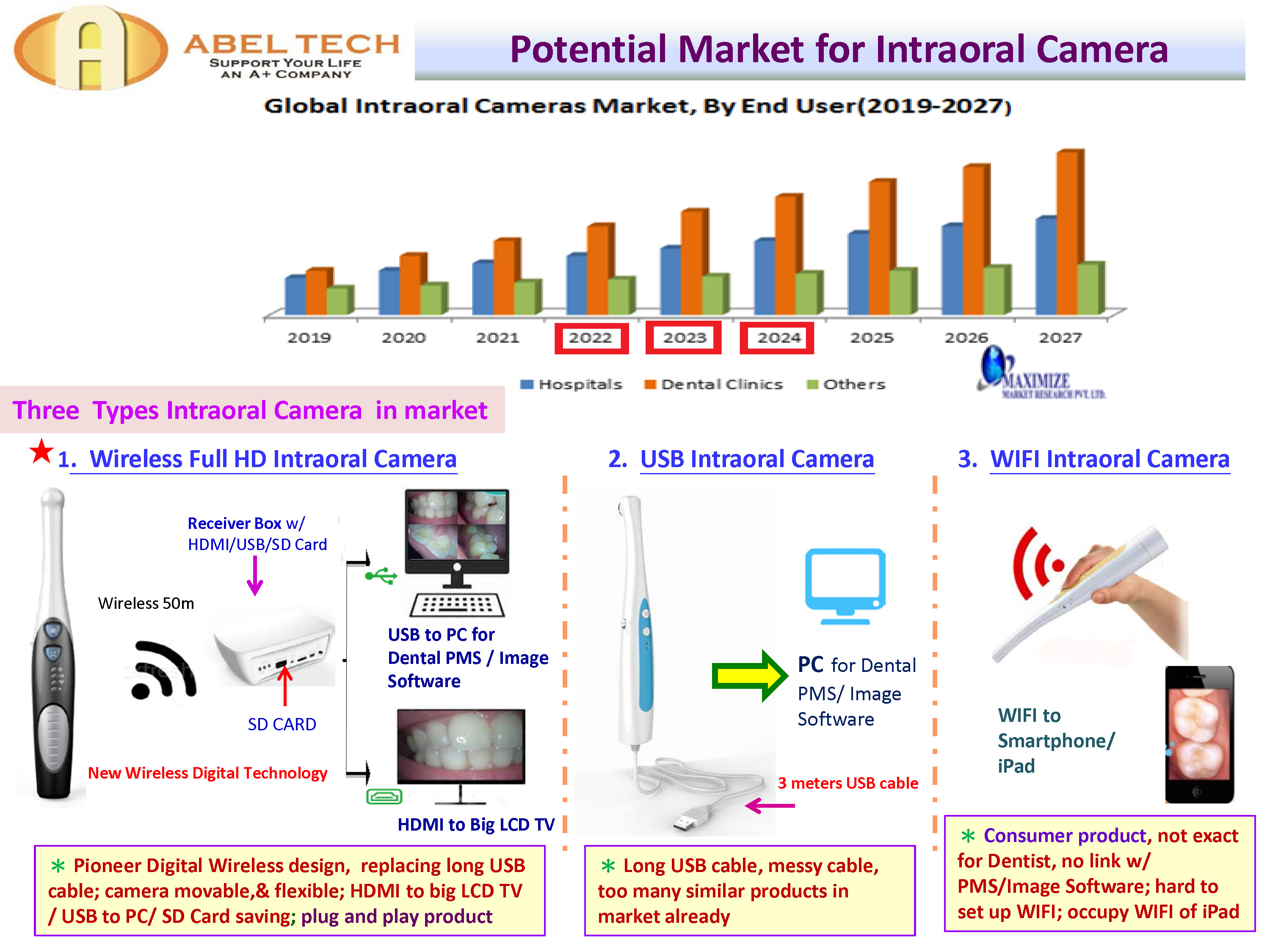 The advantages: (Wireless Dental Camera supporting Multi-video carries to PC/Big LCD TV/SD Card/iPad/Smartphone)