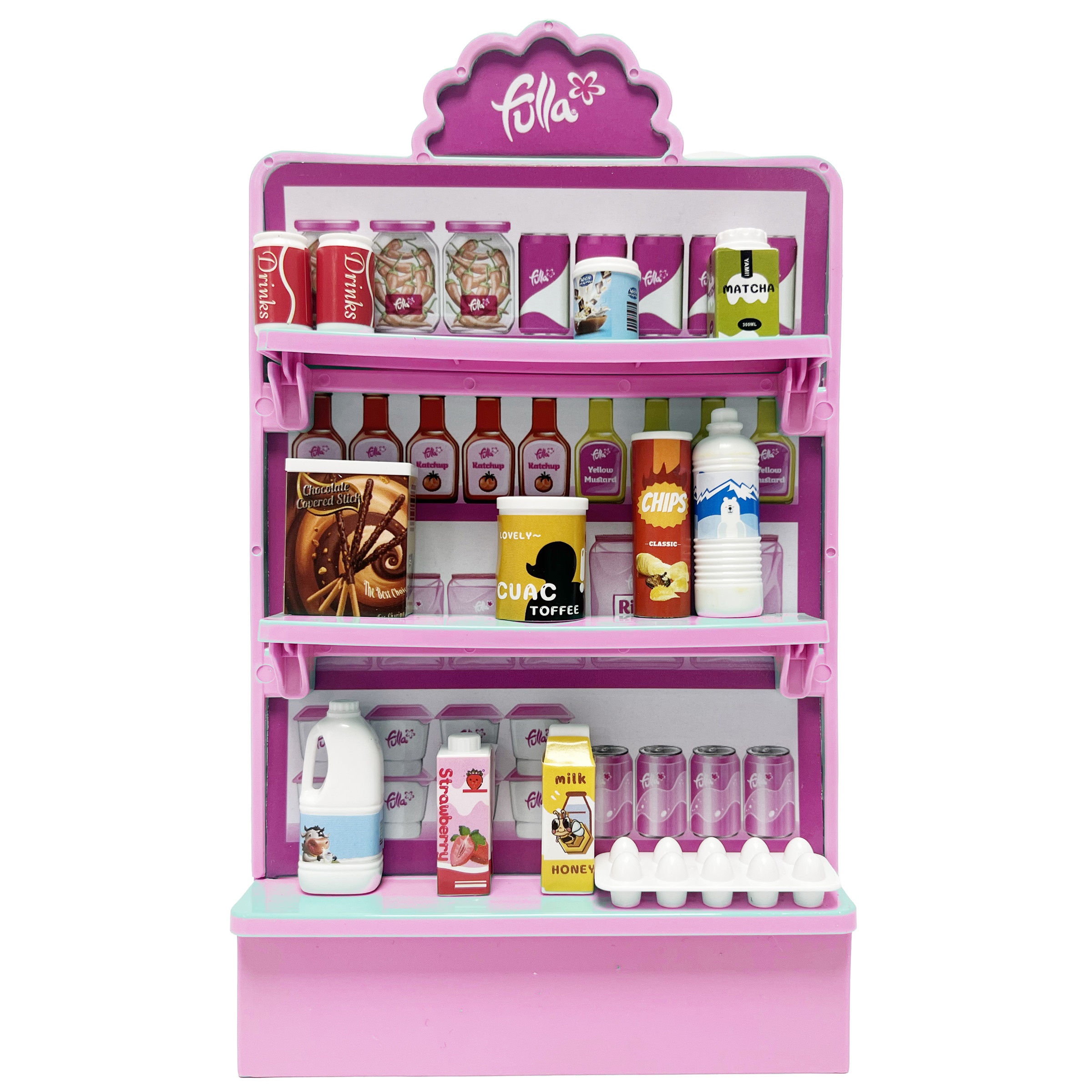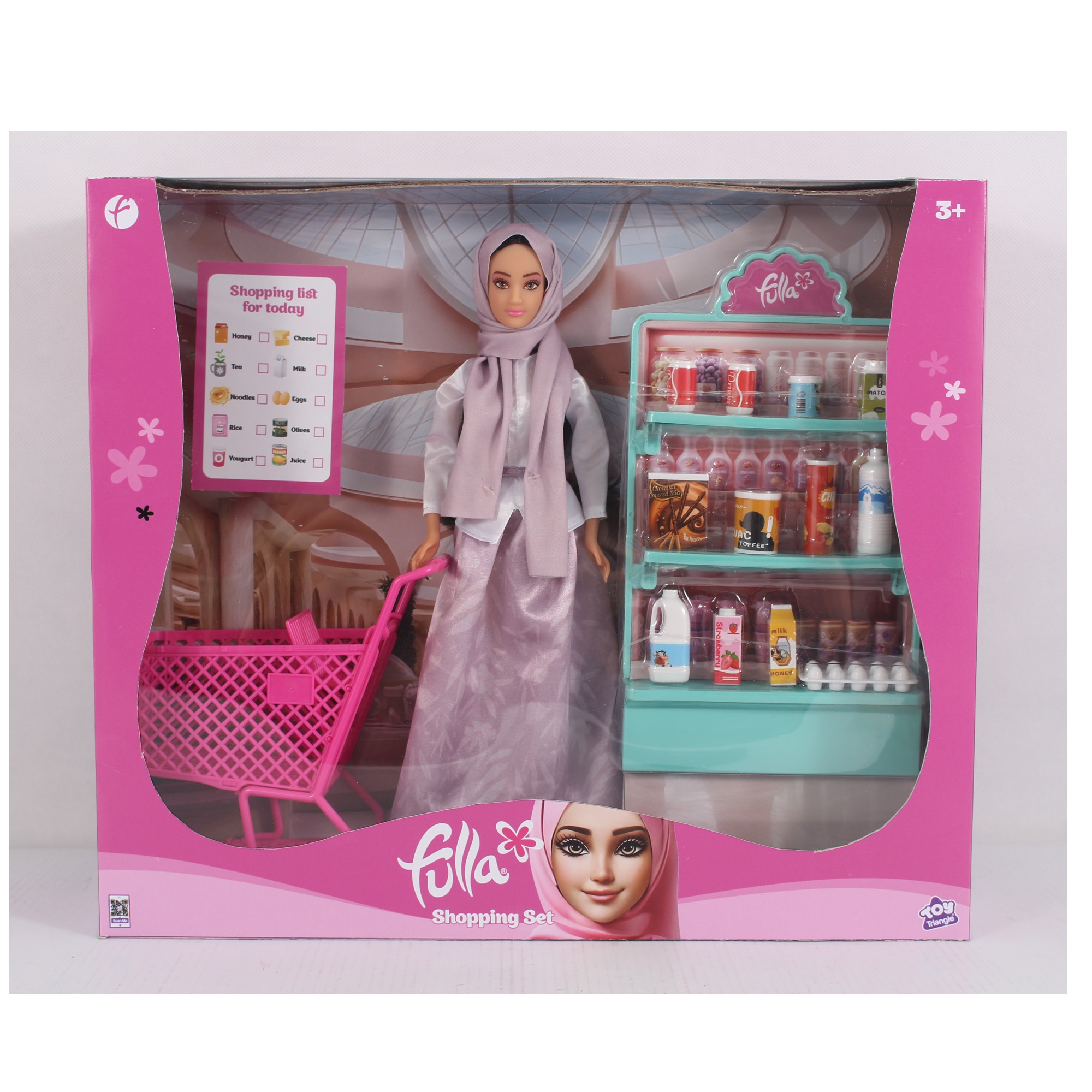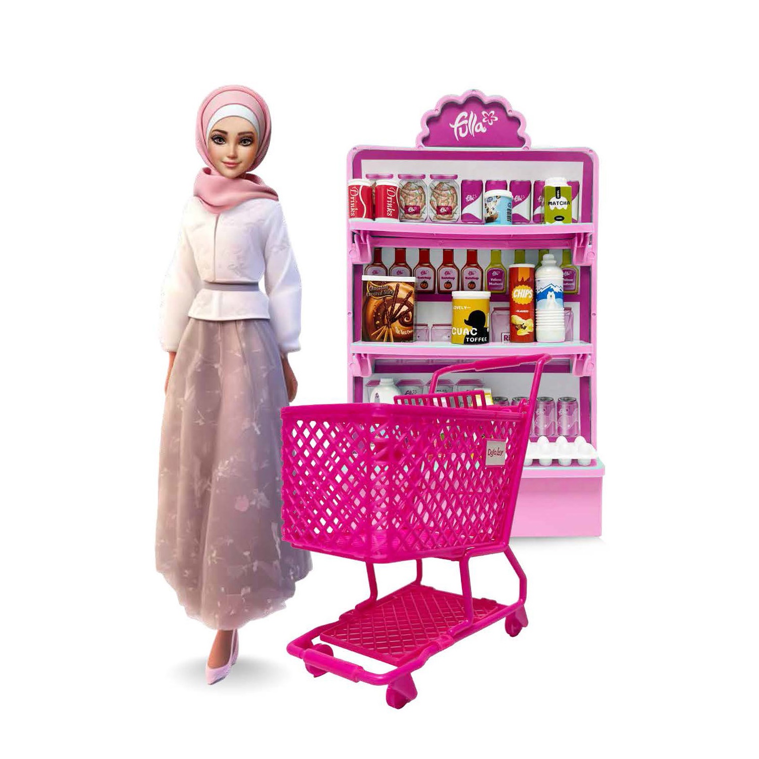 A totally new shopping experience with Fulla. Fulla Doll Shopping with shopping cart, drink bottles *4, chocolate box, potato chip *2, milk bottles *2, juice boxes *2, egg cartons and shelf.
