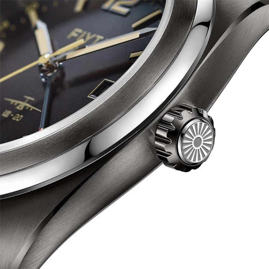 Clasp: Pin buckle. Stainless steel clasp. (Additional strap: Black. Polyester fiber 42214 front, same material for spacecraft parachute, leather back. Quick release: Remove strap from case without tool. Clasp of additional strap: Pin buckle. Stainless steel material.)