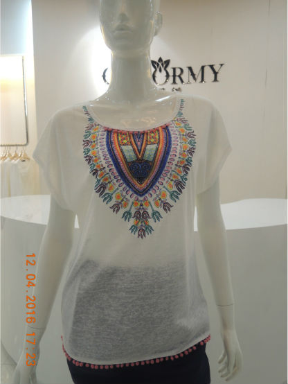 This garment is a short sleeve shirt is suitable for wear in summer.The garment is spun cotton fabric,hand feeling is soft and comfortable.In front of garment was embroidered with beautiful and colorful plants,with pink lace around the bottom.